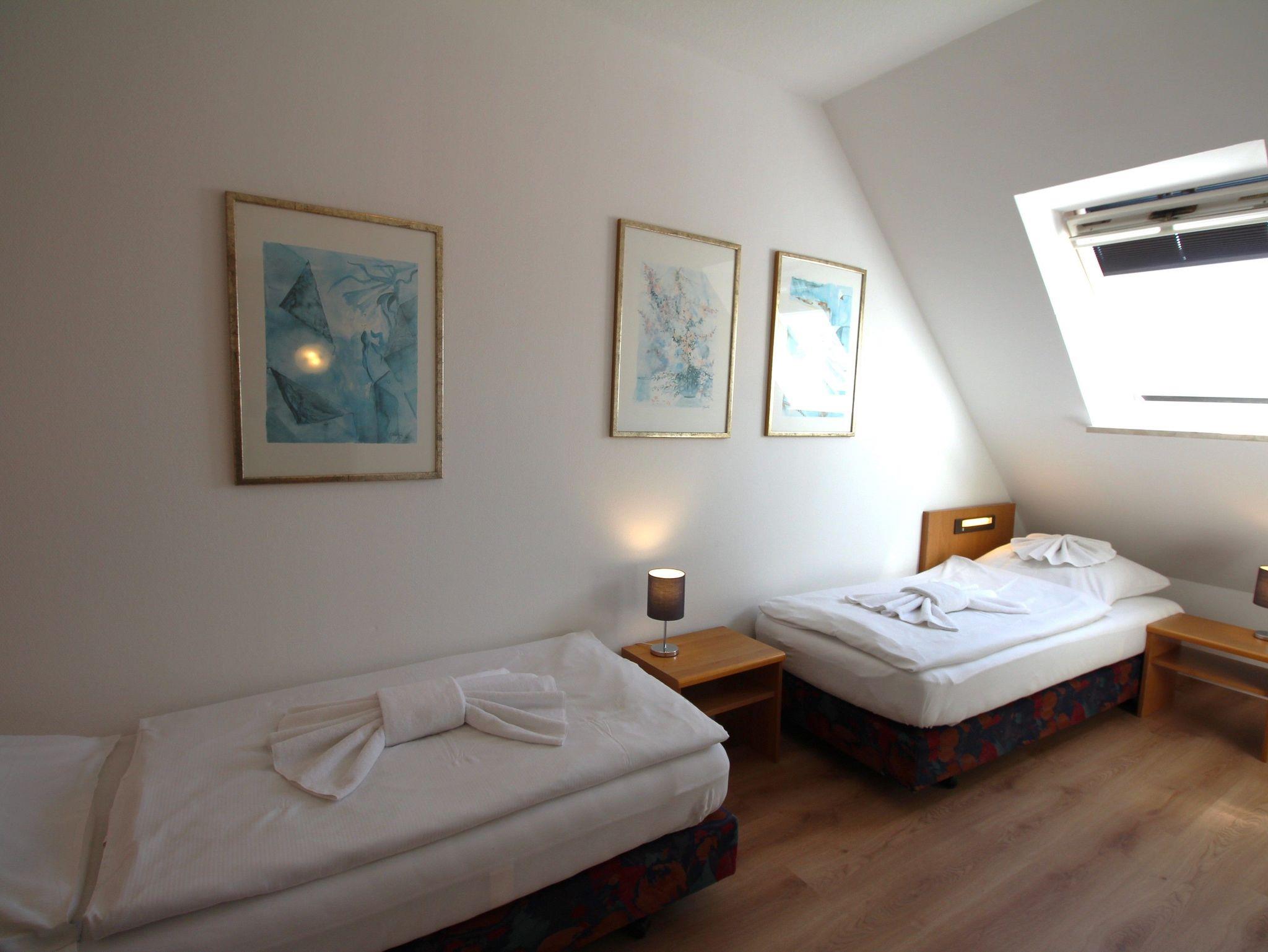 Das separate Schlafzimmer bietet zwei Einzelbetten 80 cm x200 cm mit integrierten Leselampen, geräumigem Kleiderschrank und die Schlafcouch im Wohnzimmer bietet außerdem mit 170 cm x 200 cm Liegefläche Platz für eine dritte Person. Die Wohnung verfügt über einen voll ausgestatteten Küchenbereich und ein lichtdurchflutetes Tageslichtbad.