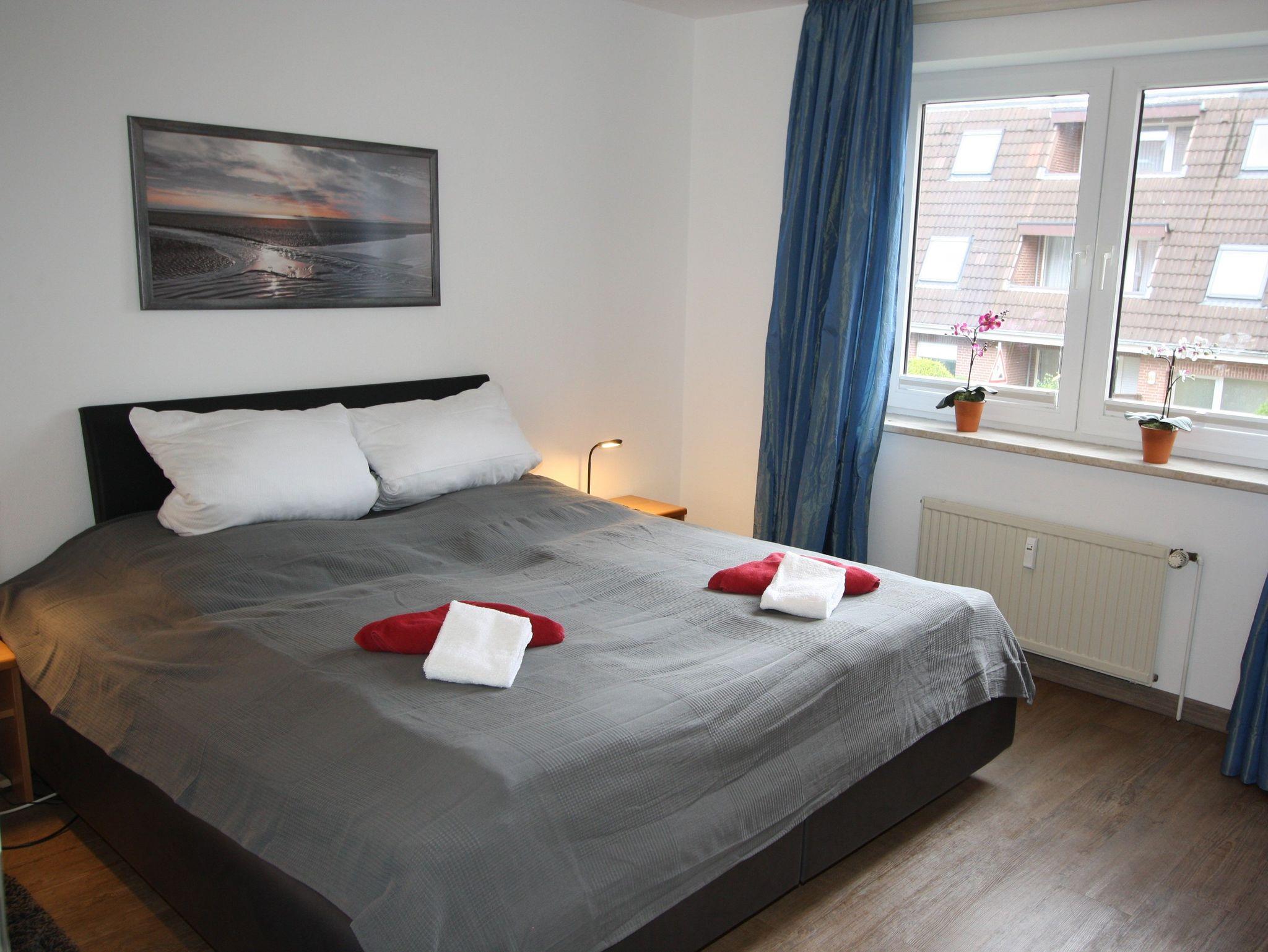 Schlafzimmer: mit modernem großem Doppelbett (200 cm x 200 cm) in Sitzhöhe, verstellbaren Lattenrosten und Kopfpolster, fahrbarem 2. LED Flachbildschirm zum bequemen Fernsehen vom Bett oder der kleinen Sitzgruppe, Blue-ray Player, ausreichend Platz im Kleiderschrank mit Ganzkörperspiegel, Verdunklungsrollo, Platz für zusätzliches Kinderbett.