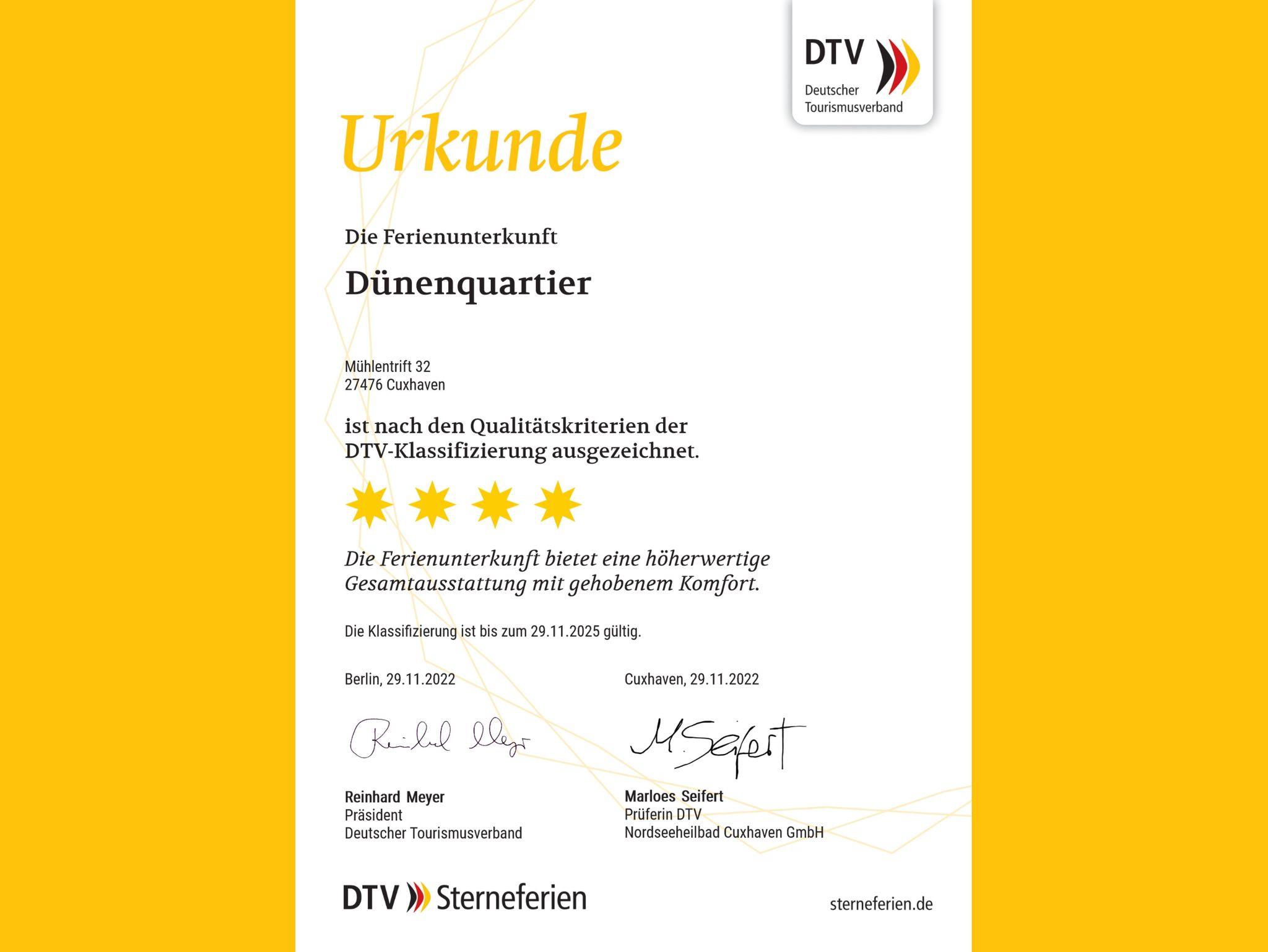 Das Dünenquartier ist vom Deutschen Tourismusverband (DTV) offiziell nach deren Qualitätskriterien geprüft und mit 4 Sternen ausgezeichnet. Entsprechend der DTV Zertifizierung verspricht die Unterkunft eine höherwertige Gesamtausstattung mit gehobenem Komfort.