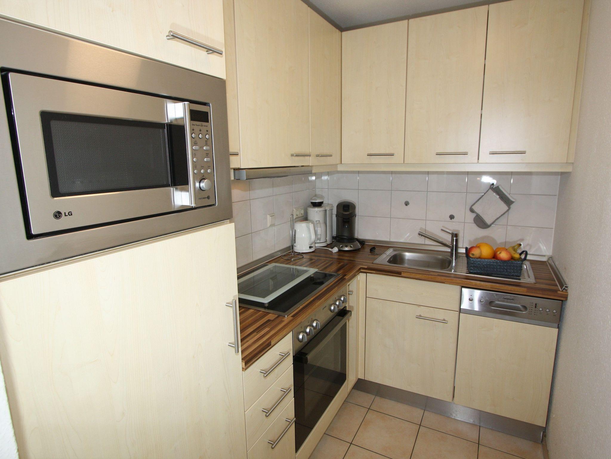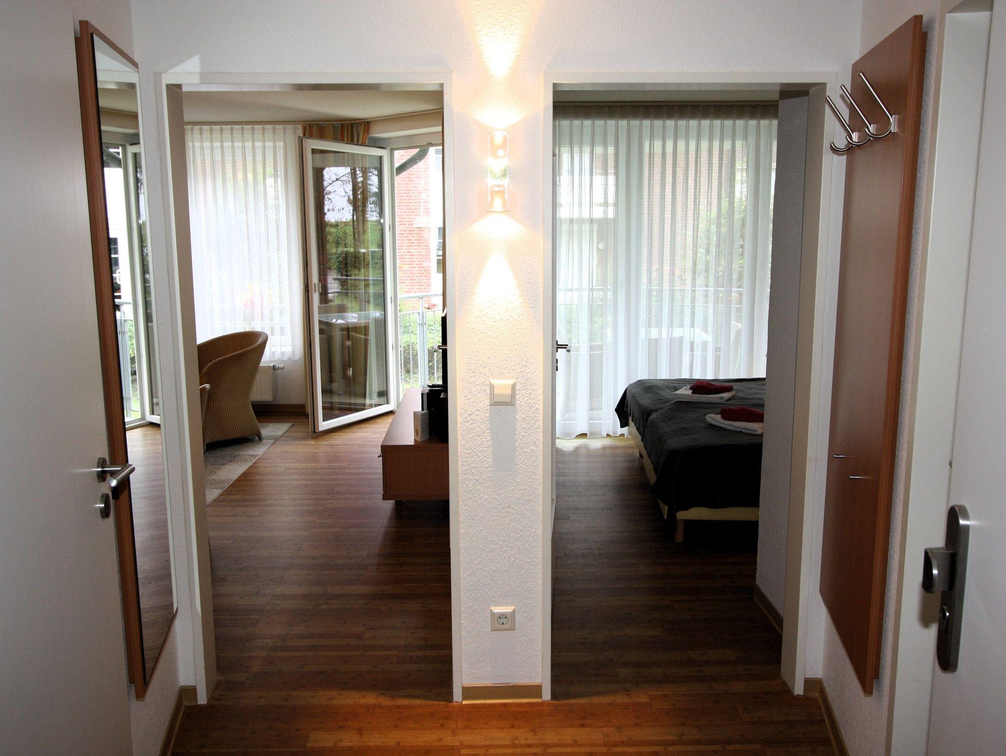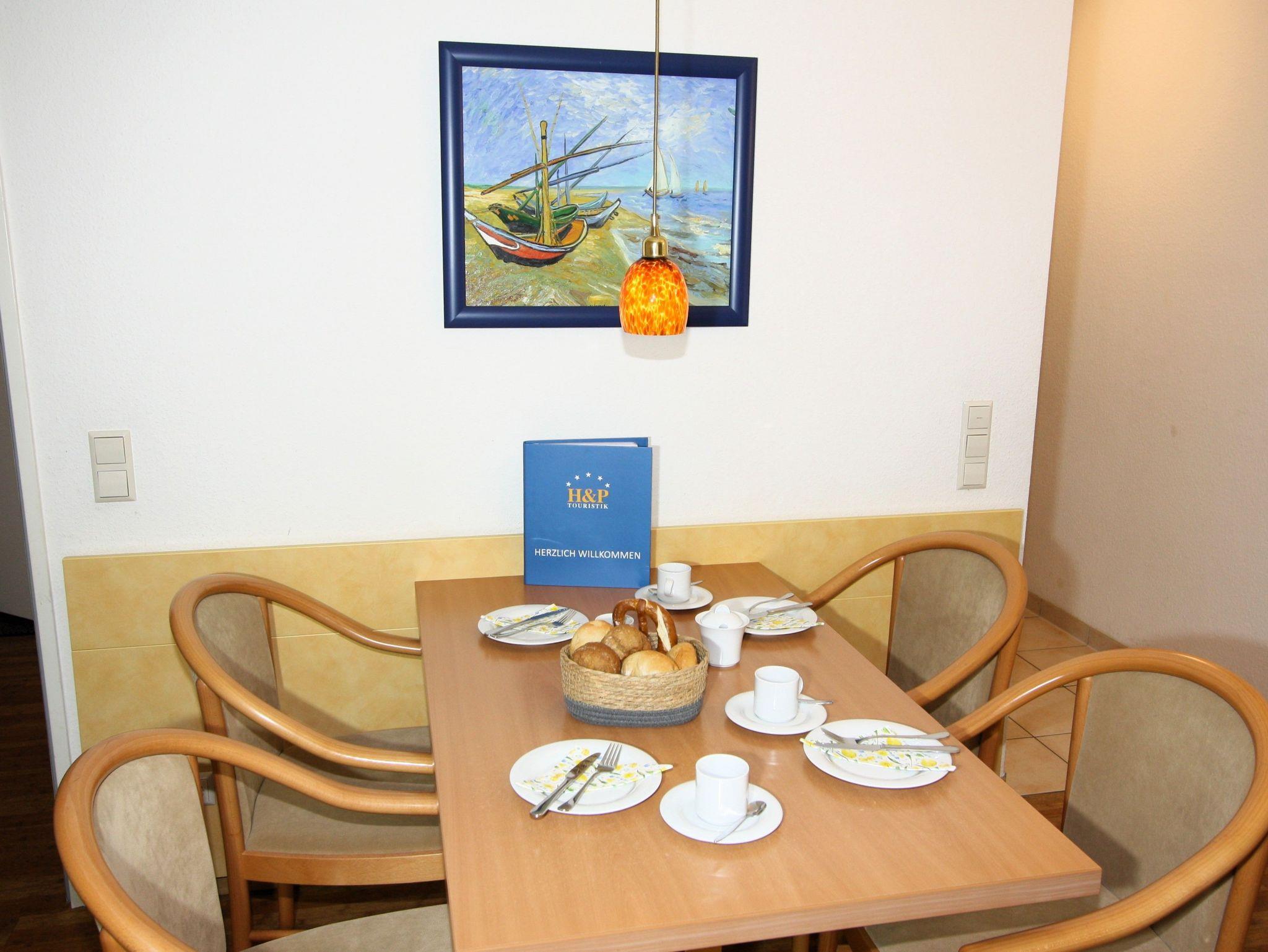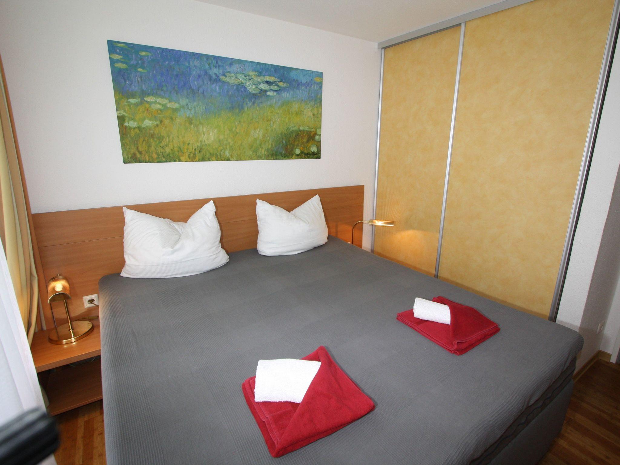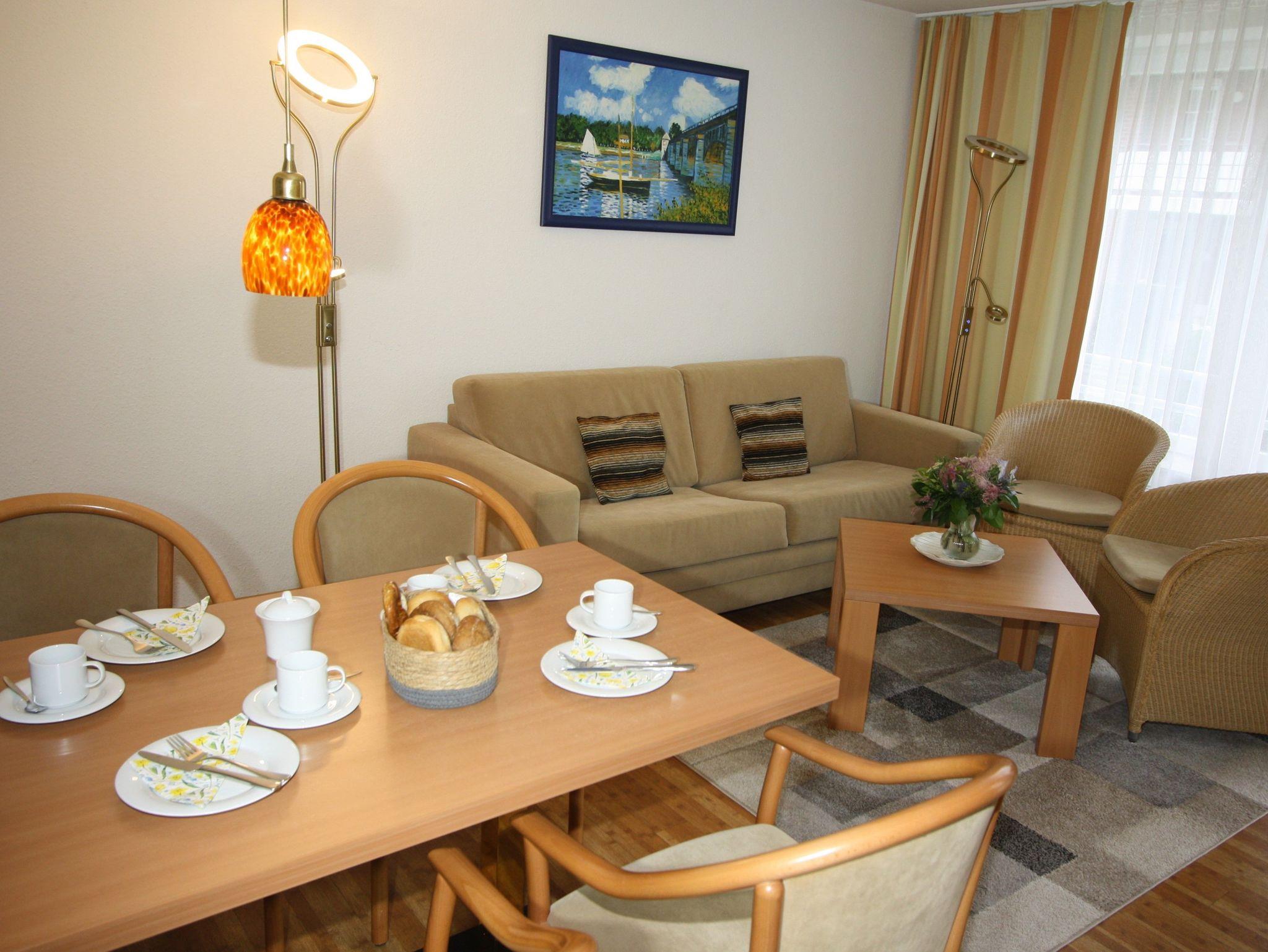 2-Zimmer-Appartement für bis zu 4 Personen, ca. 48 m², ein Schlafzimmer mit Doppelbett (auch als Einzelbetten stellbar), großer heller Wohn-/Schlafraum mit bequemer Doppelbettcouch, separater Essplatz, voll ausgestatteter Küchenbereich mit Geschirrspüler, Dusche/WC, Balkon, Abstellraum, SAT-TV.