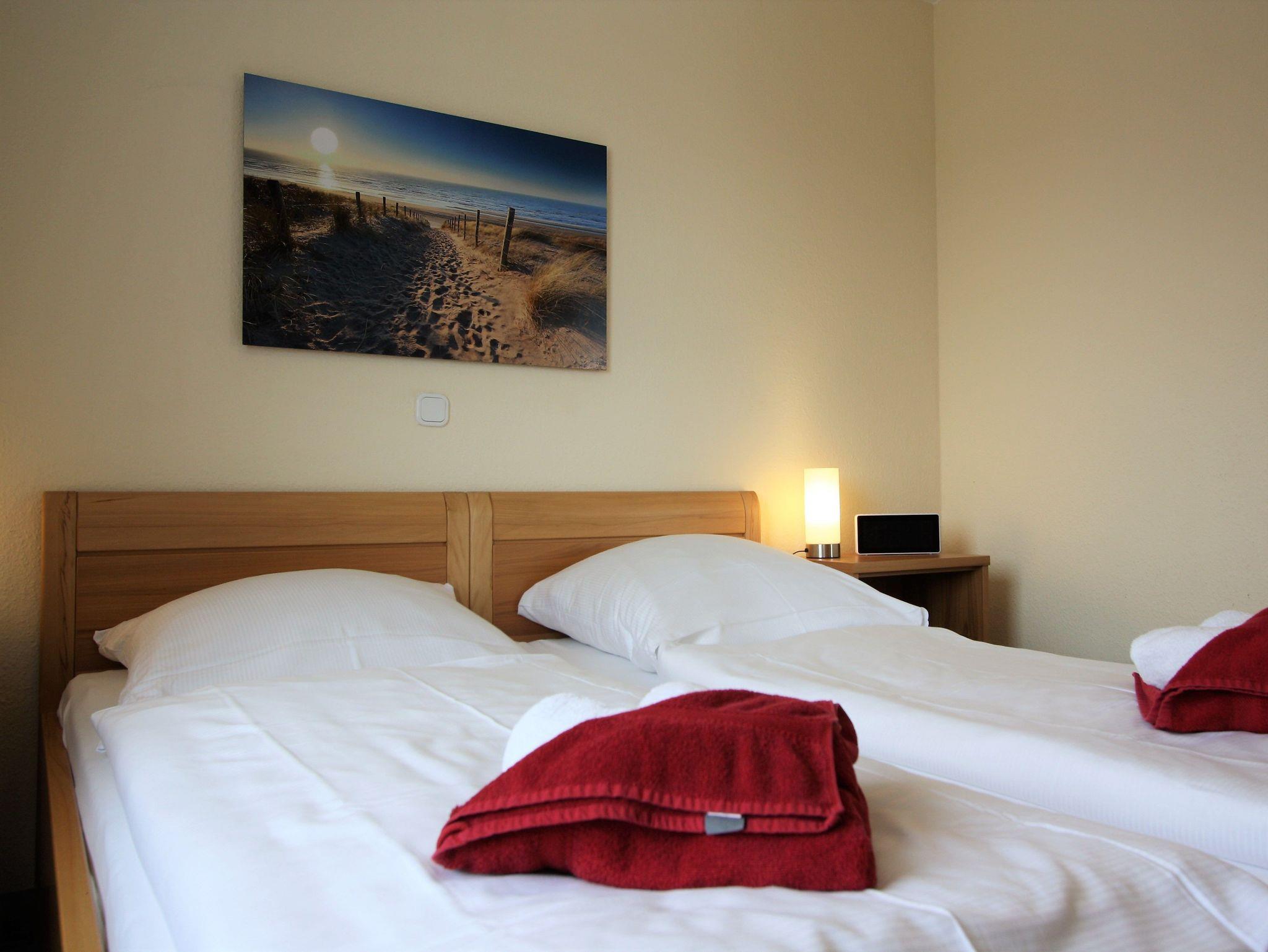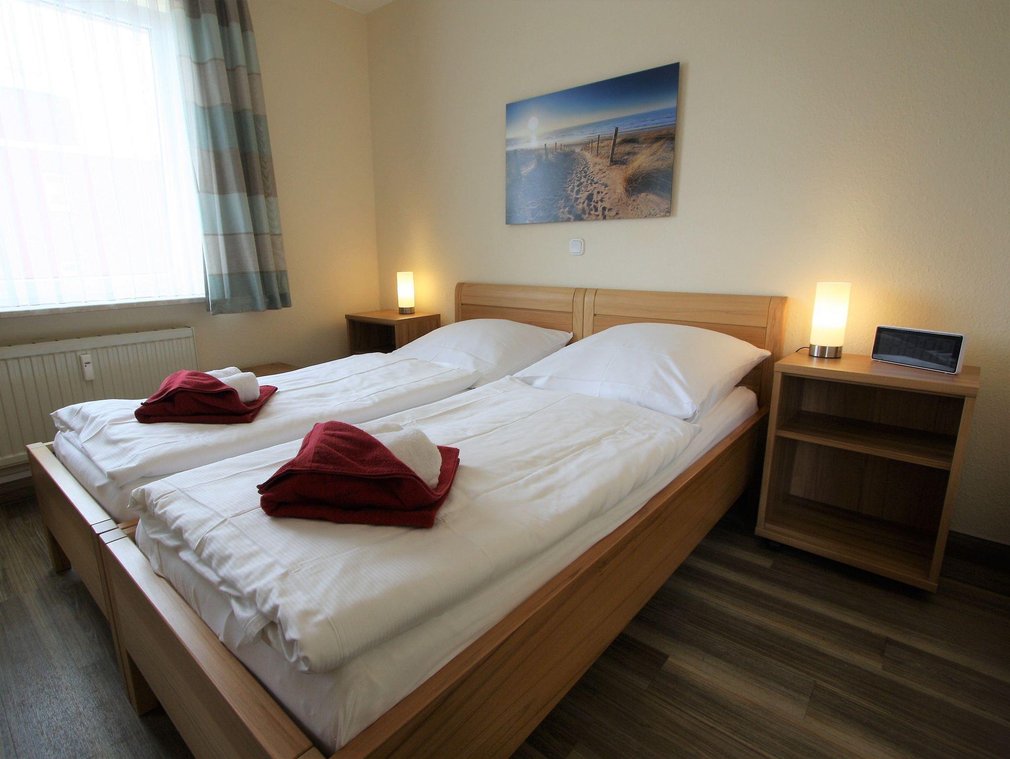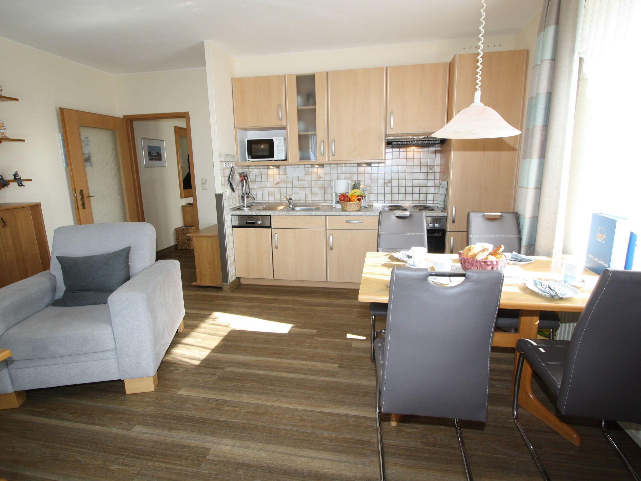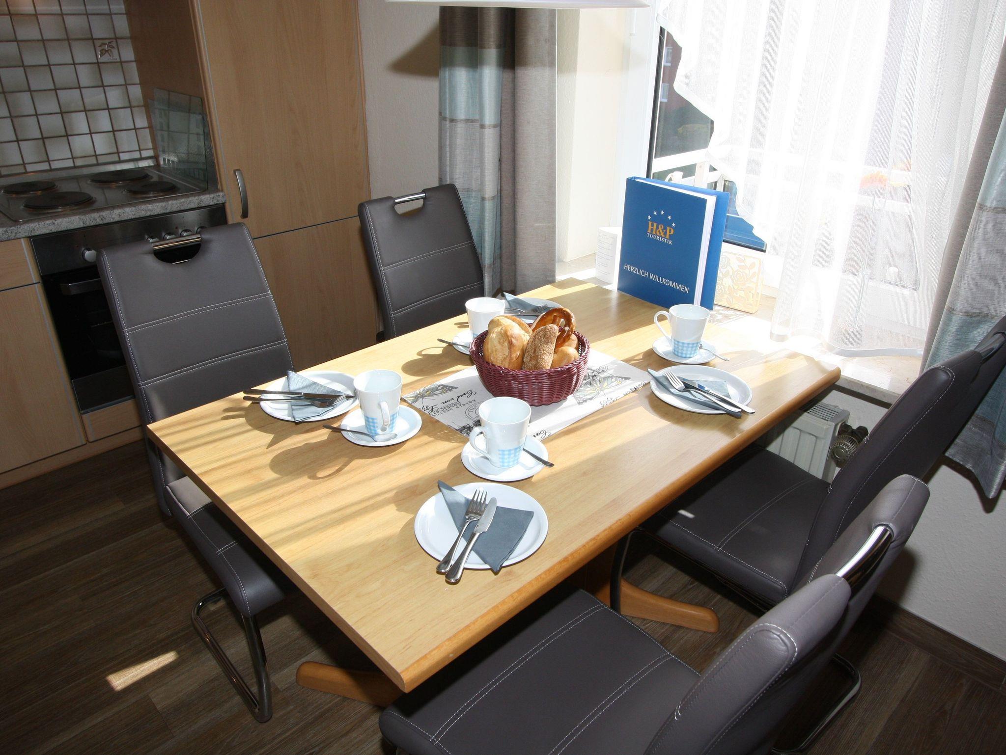 Sie wohnen in einem 2-Zimmer-Appartement für bis zu 4 Personen auf ca. 57 m² Wohnfläche im 3. OG. Schlafzimmer mit Doppelbett und TV-Gerät ausgestattet, separater Essplatz mit angrenzendem Wohnbereich und einer hochwertigen Schlafcouch, voll ausgestatteter Küchenbereich mit Geschirrspüler und Mikrowelle, Dusche/WC, großer Süd-/Westbalkon und SAT-TV.