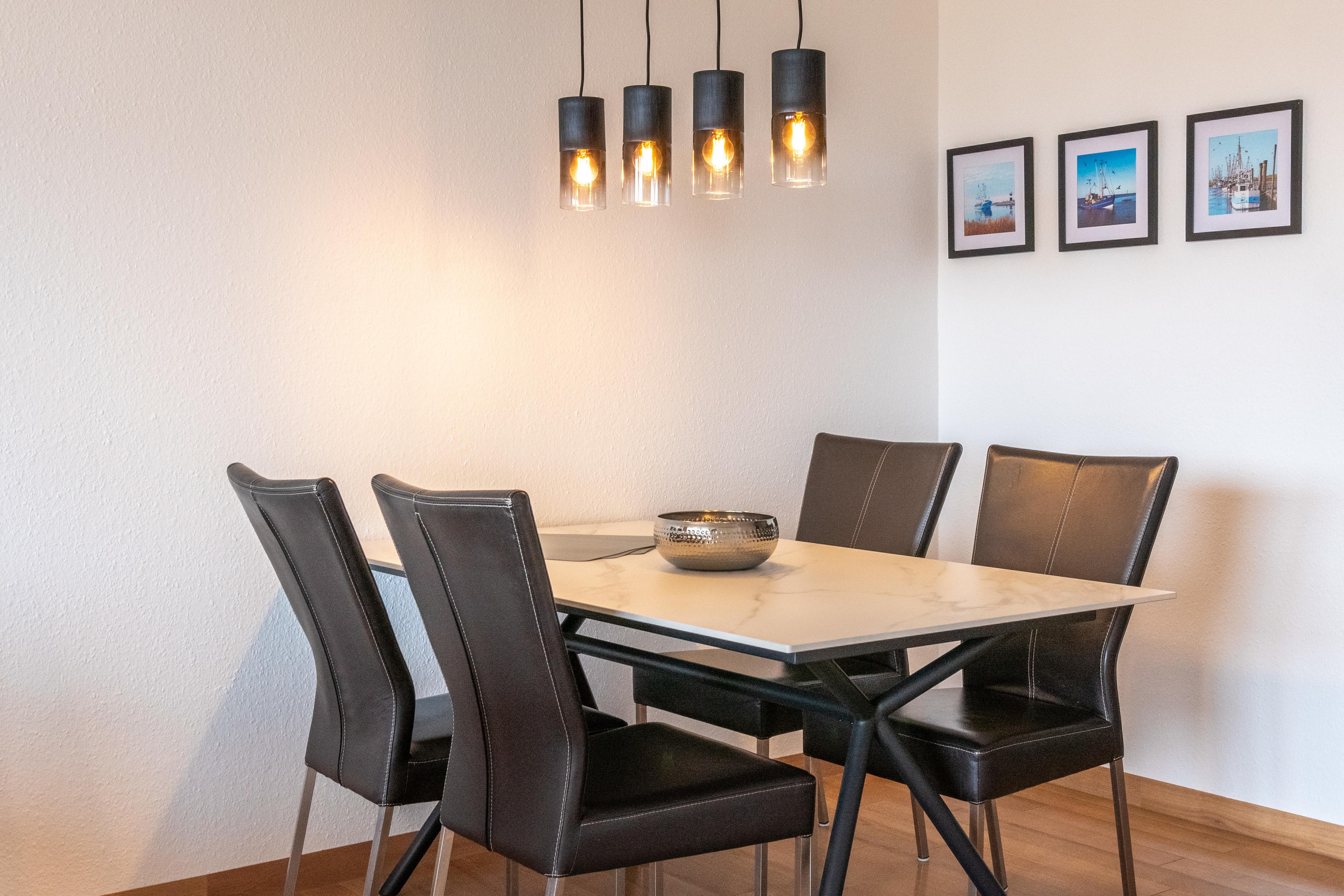 Der Wohnbereich geht fließend über in den Essbereich, in welchem Sie einen großen Designmassivholztisch mit bequemen Stühlen finden.