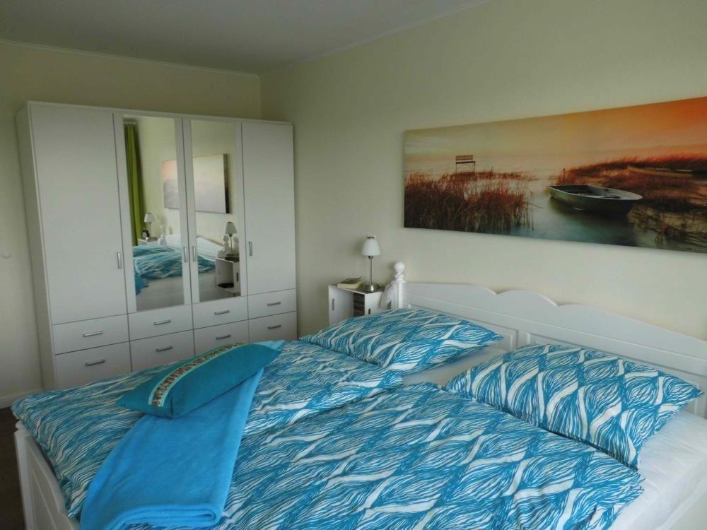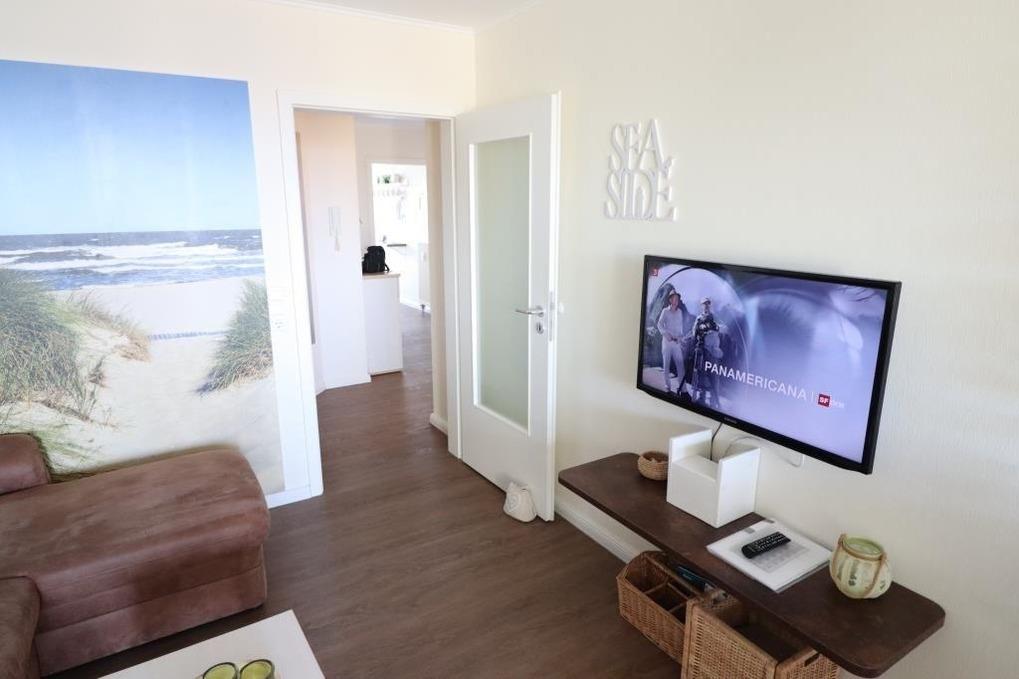 Renovierte Ferienwohnung mit einem Schlafraum mit einem Doppelbett, einem Schlafraum mit einem Einzelbett und einem Einzelschrankbett, ein Wohnraum mit Seesicht, separate Küche mit Geschirrspüler, Backofen und Kühlschrank, Dusche / WC, 3 x TV