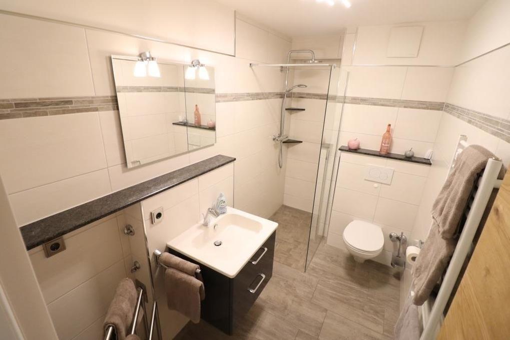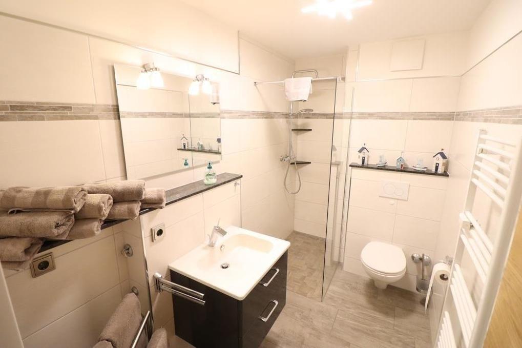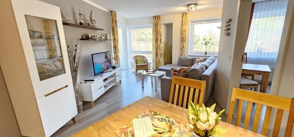 Gemütliche Ferienwohnung mit einem Schlafraum mit einem Doppelbett, einem Schlafraum mit zwei Einzelbetten, ein Wohnraum, Küchenzeile mit Geschirrspüler, Backofen und Kühlschrank, Dusche / WC, 2 x TV
