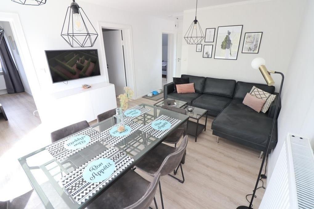 Es stehen Ihnen 3 Schlafräume zur Verfügung (1 Etagenbett und 2 x 1 Doppelbett). 1 Wohnraum mit gemütlichem Sofa und Essplatz und Smart-TV. Die Küchenzeile ist mit einem Kühlschrank, einem Backofen, einem Ceranfeld und einem Geschirrspüler ausgestattet. 1 Badezimmer mit Dusche / WC.