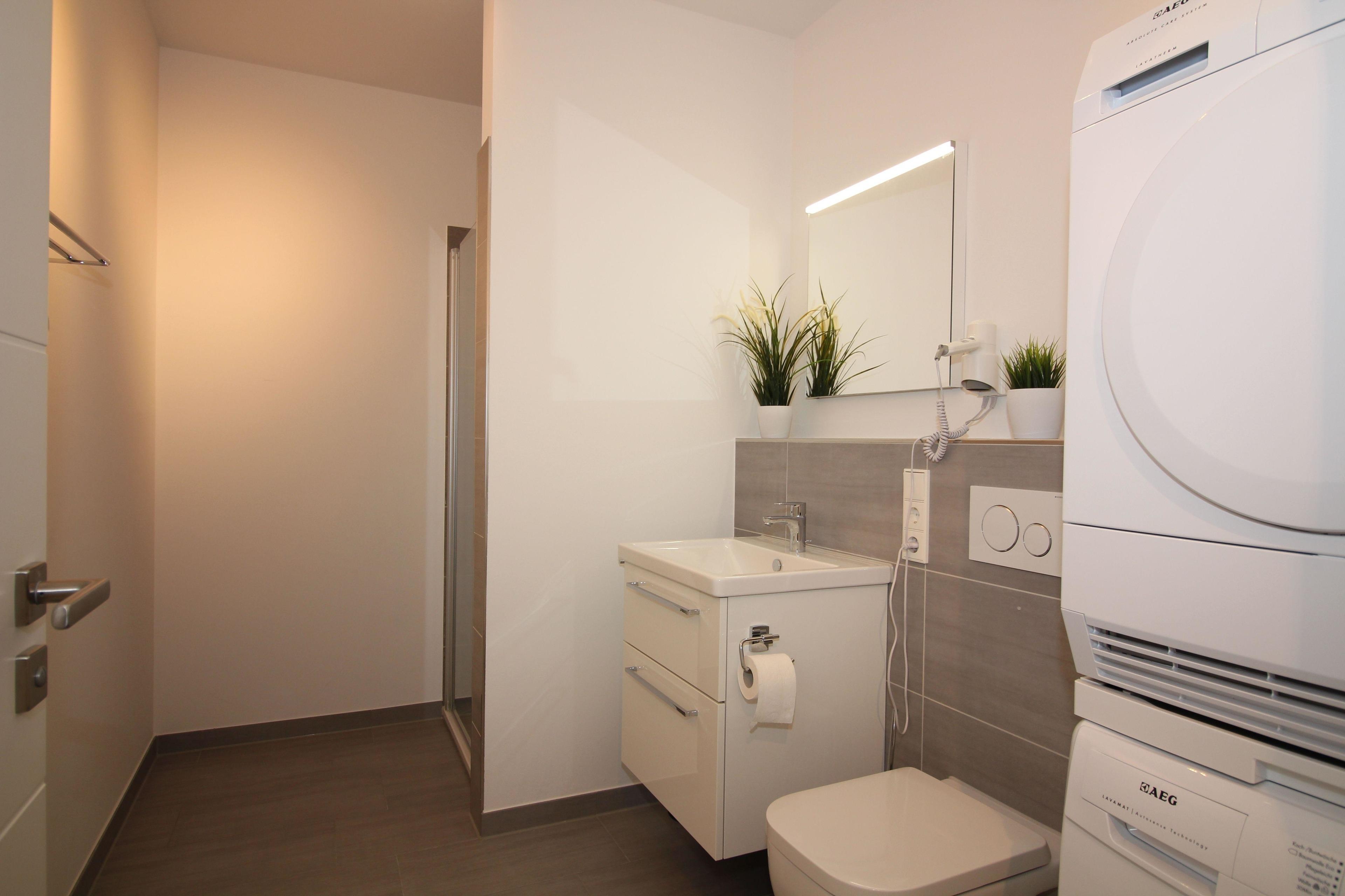 Reservierter Stellplatz im Carport, Fahrradkeller und ein eigener abschließbarer Kellerraum mit Steckdose für E-Bikes, Alle Fenster haben ein eklektisch betriebene Rollo, eigener DSL50 LAN und WLAN Anschluss, Smart TV 2x40“ und 1x55“ internetfähig und LAN angeschlossen, HiFi-Anlage mit Bluetooth, verglaste Loggia und Balkon, bodentiefe Dusche mit Thermostat und Handbrause, Balkon und Hartholz-Belag, Allergiker-geeignete Bodenbeläge und Betten.