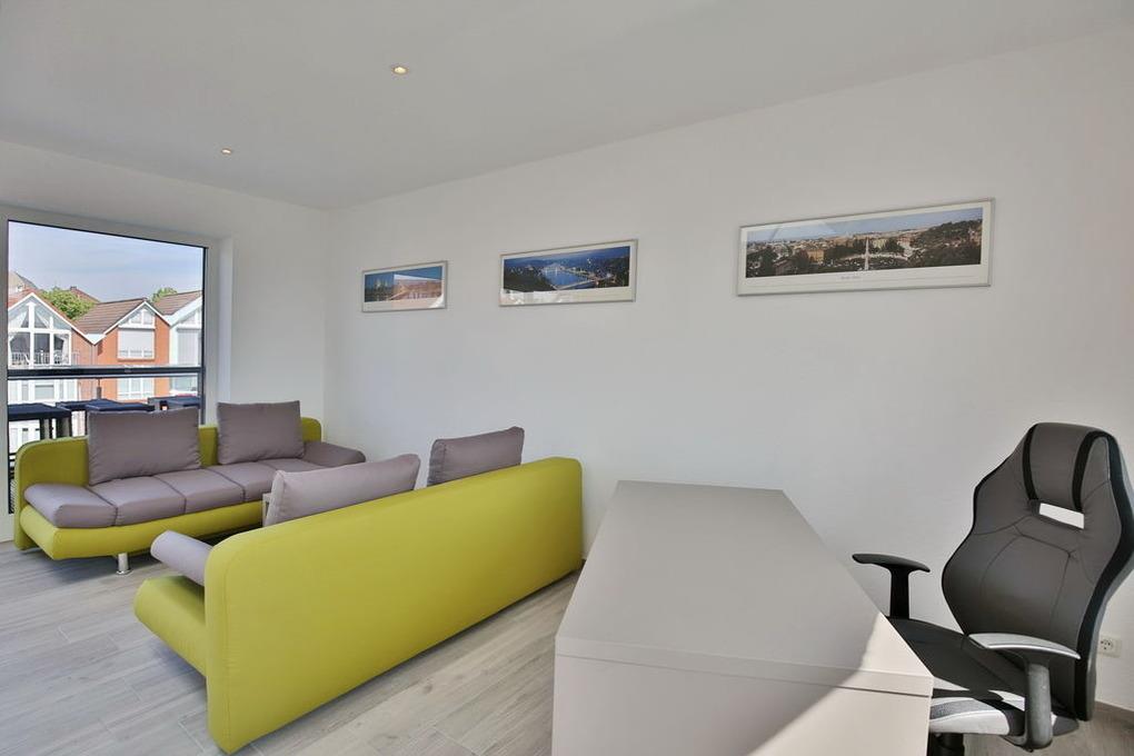 Neubau auf 4 Etagen für bis zu 7 Personen direkt in der City Marina. Großzügiges Wohnzimmer mit Smart-TV, große Terrasse mit Blick in die City Marina, offener Küche in Vollausstattung, Gäste-WC. 1.OG: 1 Schlafzimmer mit Doppelbett und Smart-TV, Bad mit Dusche/WC, Bidet und Sauna, Balkon (ost). 2.OG: 1 Schlafzimmer mit Doppelbett, 1 Schlafzimmer mit franz. Doppelbett (1,40x2m), Bad mit Dusche/WC und Bidet, Waschmaschine/Trockner. 3.OG: Lounge mit Schlafsofa, Smart-TV und großer Dachterrasse (west). Wohn -und Schlafräume mit Außenjalousien, das Haus verfügt über eine temperaturgesteuerte Kühlung, kostenfreies W-Lan, Fahrradschuppen (eBike Lademöglichkeit), 1 PKW-Stellplatz am Haus.