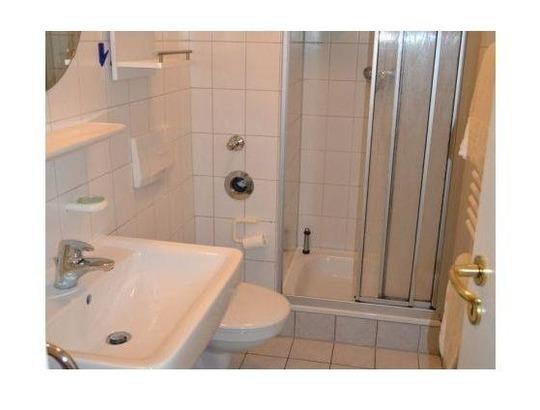 Das Bad verfügt über eine Dusche, ein WC und ein Waschbecken mit Spiegel.