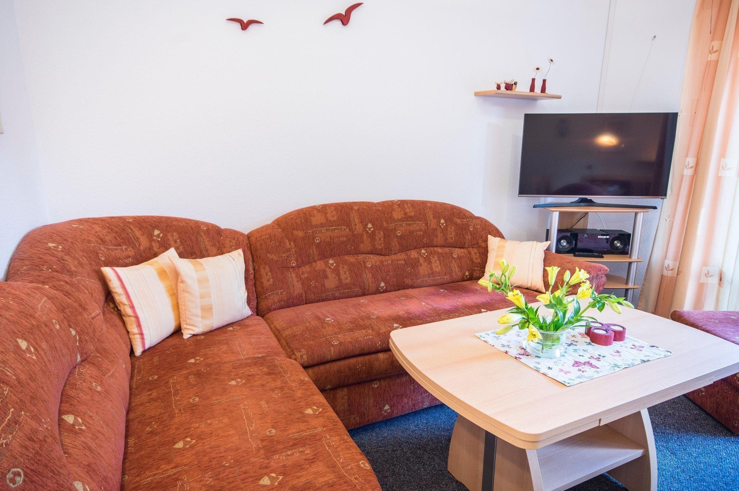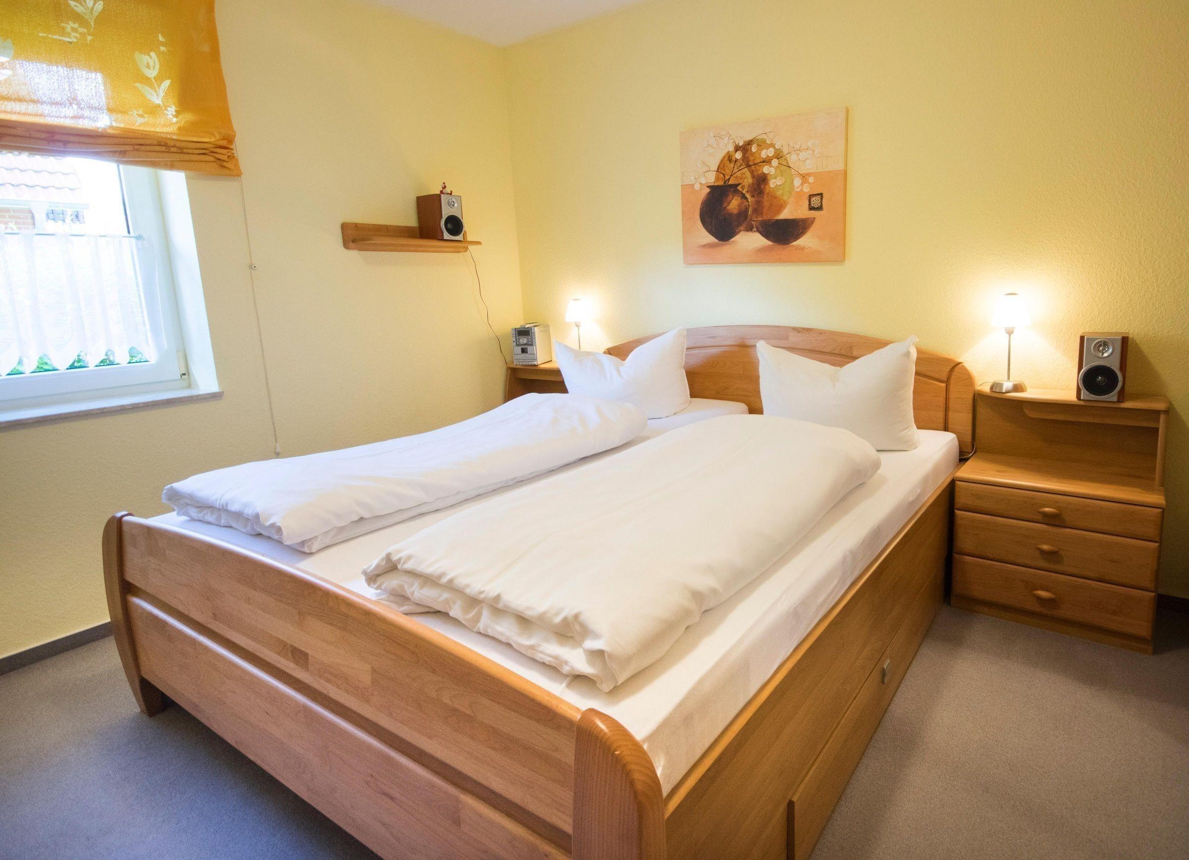 Die gemütliche 4-Personen-Ferienwohnung im Erdgeschoss bietet auf 60 qm eine praktische Raumaufteilung und moderne Ausstattung. Sie verfügt über zwei komfortable Schlafzimmer, in denen Gäste zur Ruhe kommen können. Die offene Küche ist mit einem 4-Platten-Herd, Backofen, Mikrowelle, Kühlschrank mit Gefrierfach sowie Küchenkleingeräten wie Kaffeemaschine, Toaster und Wasserkocher ausgestattet. Das einladende Wohnzimmer mit einem Schlafsofa lädt zu geselligen Abenden ein. Ein Badezimmer ist ebenfalls vorhanden.