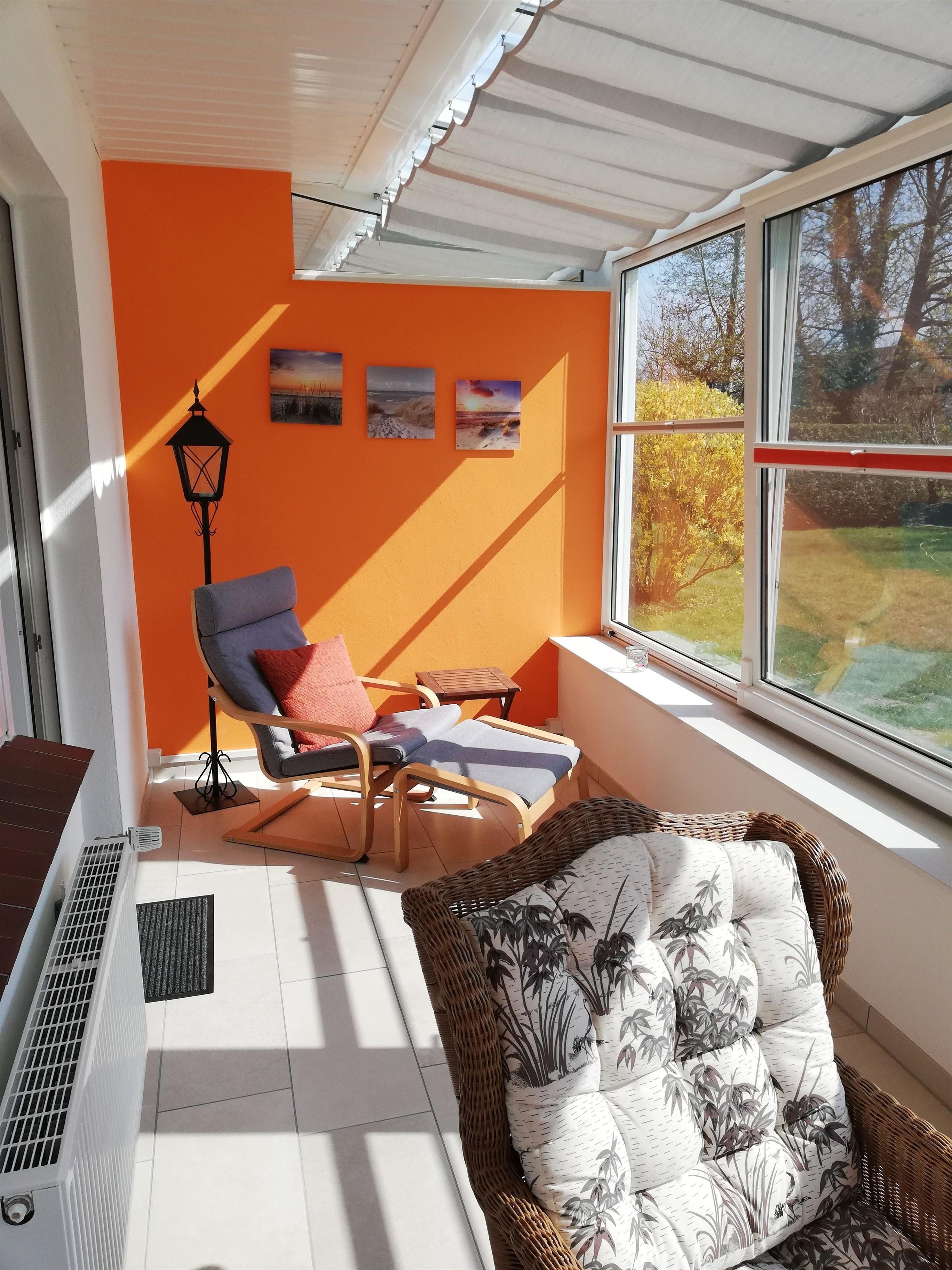 Die Ferienwohnung ist gemütlich eingerichtet und teilt sich auf in einen kombinierten Wohn- und Schlafbereich und Durchgang zum beheizten Wintergarten mit Blick ins Grüne, ein Esszimmer, eine voll ausgestattete Küche, ein Duschbad und eine Terrasse inkl. Möblierung und Auflagen. Es ist Platz für max. 2 Personen.