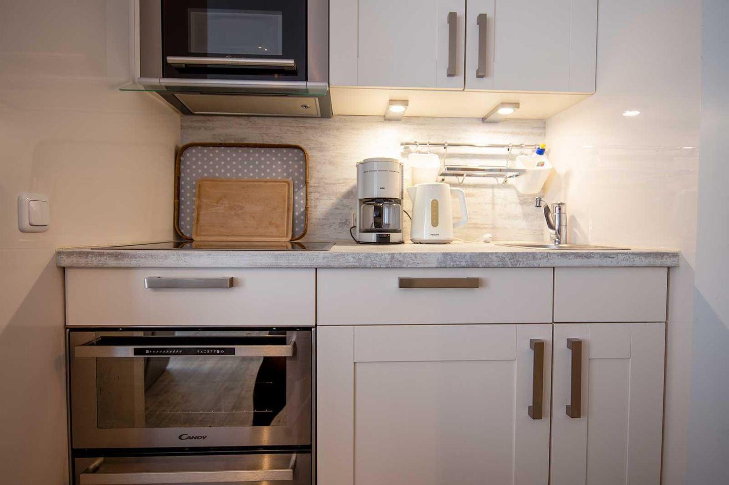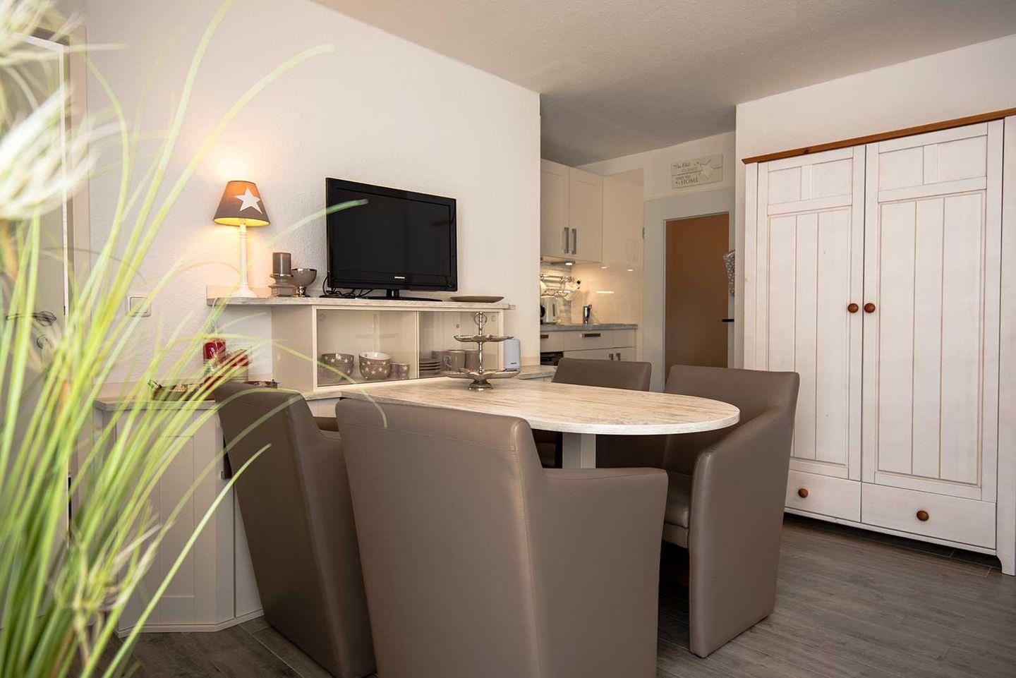 Im Wohn- und Schlafraum mit offener Küche befinden sich ein schöner Essplatz, ein gemütliches Sofa sowie ein Doppelbett. Die kleine Küchenzeile ist voll ausgestattet mit Geschirrspüler, Ceran-Kochfeld, Mikrowelle und Backofen. Ein separater Schlafraum verfügt über 2 Einzelbetten. Ein modernes Duschbad komplettiert das Angebot.