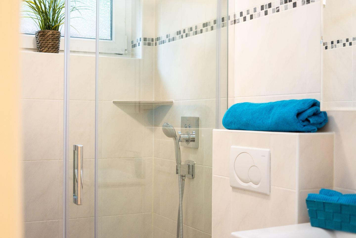 Das moderne Tageslichtbad verfügt über eine Walk-In Dusche und einen beleuchteten Spiegelschrank.