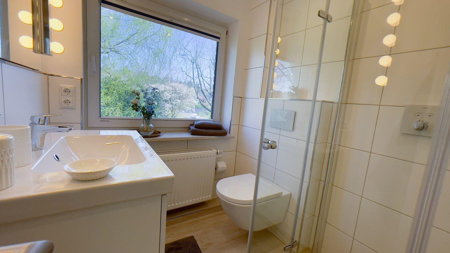Das moderne, helle Tageslichtbad ist mit einer bodengleichen Dusche ausgestattet.