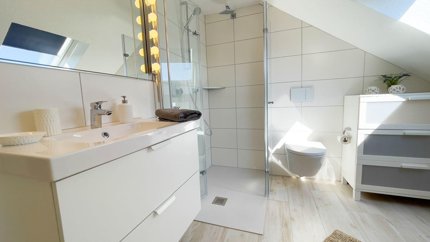 Das großzügige Wellness-Badezimmer bietet eine bodengleiche Dusche und eine Whirlpool-Badewanne. Der perfekte Ort, um nach einem langen Urlaubstag zu entspannen.