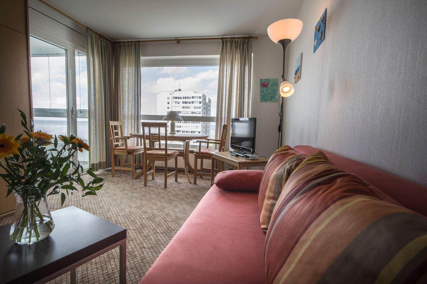 Die Ferienwohnung Frische Brise FeWo 10.08 befindet sich im 10. Stock und bietet Ihnen auf 25 m² eine behagliche Unterkunft für zwei Personen. Genießen Sie den einmaligen Blick auf das Meer und den Strand in nur 300 m Entfernung. Die Wohnung verfügt über eine voll ausgestattete Küche, Balkon, sowie ein gemütliches Wohnzimmer mit Schrankklappbett und Bad. Zu den Annehmlichkeiten im Haus zählen ein Innenpool, Sauna und gemeinschaftliche Waschmöglichkeiten und Trockner.