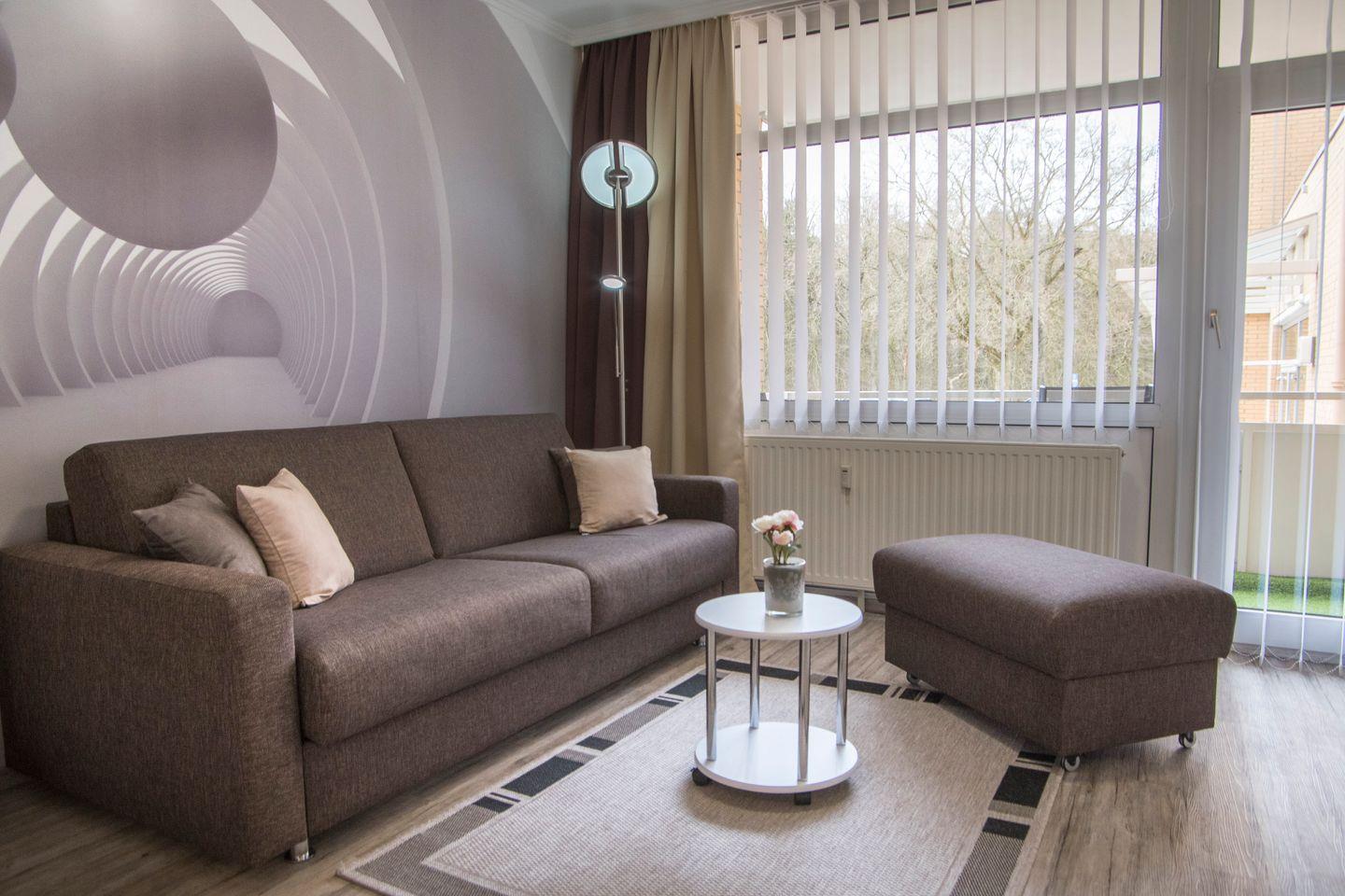 Die Wohnung vereint modernen Komfort mit einer freundlichen Atmosphäre. Der offene Wohnbereich beherbergt eine gemütliche Sofaecke, die zum Entspannen und Verweilen einlädt. Mit wenigen Handgriffen lässt sich das Schlafsofa in ein Doppelbett verwandeln. Der Essbereich ist ideal für gemeinsame Mahlzeiten. Die vollständig ausgestattete Küche bietet Ihnen neben einem Cerankochfeld auch eine Spülmaschine, eine Mikrowelle, einen Kühlschrank sowie diverse Küchengeräte wie einen Toaster, eine Kaffeemaschine und einen Wasserkocher – alles, was Sie für die Zubereitung köstlicher Speisen benötigen.