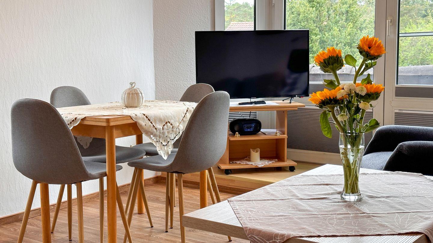 Die Ferienwohnung verfügt über ein gemütliches Schlafzimmer und einem lichtdurchfluteten Wohnbereich mit Schlafsofa, der offen zur voll ausgestatteten Küche gestaltet ist. Genießen Sie gemeinsame Stunden am Esstisch oder entspannen Sie sich auf dem bequemen Sessel, während Sie Ihre Lieblingssendung im Fernsehen anschauen.