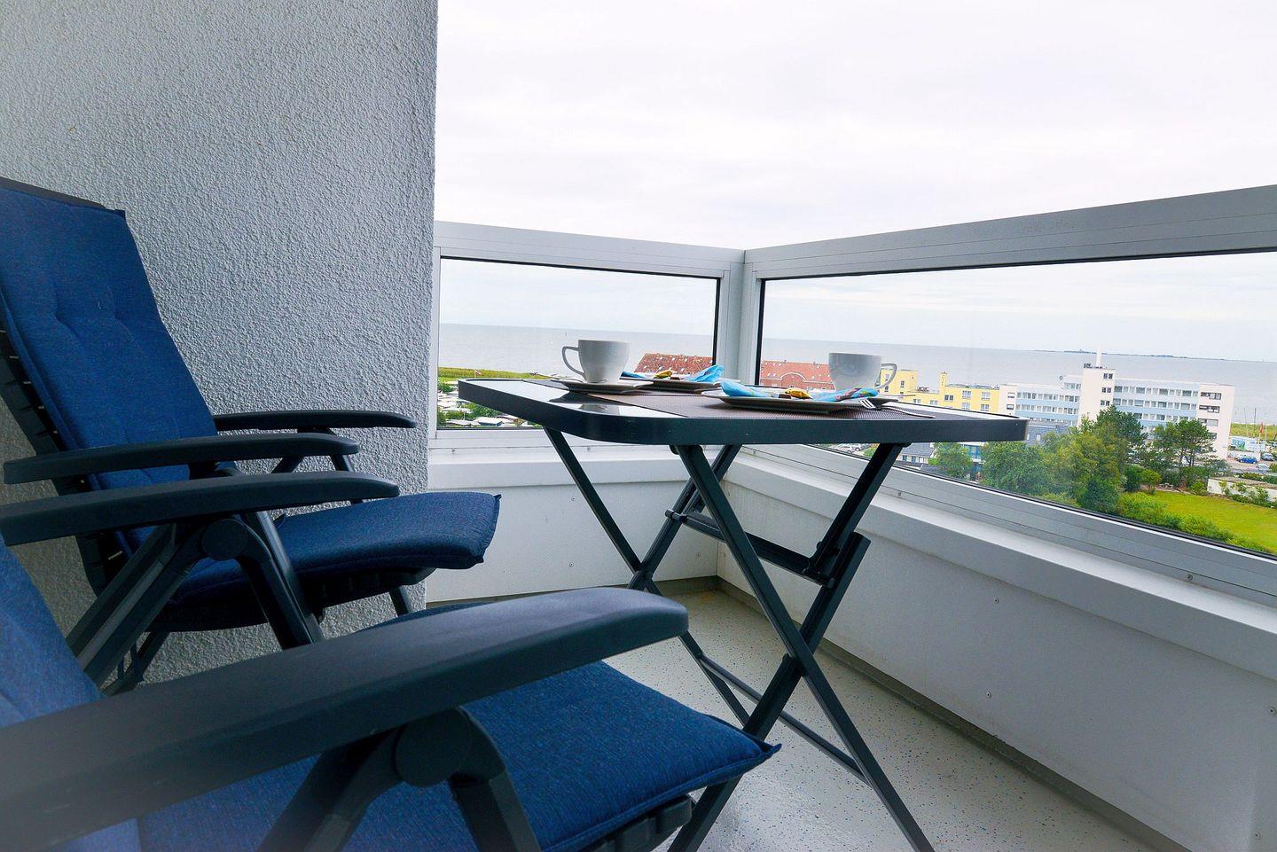 Entspannte Stunden auf dem Balkon mit Seesicht, der Urlauber dazu einlädt den Tag, nach den schönen Stunden am Strand, gemütlich ausklingen zu lassen.