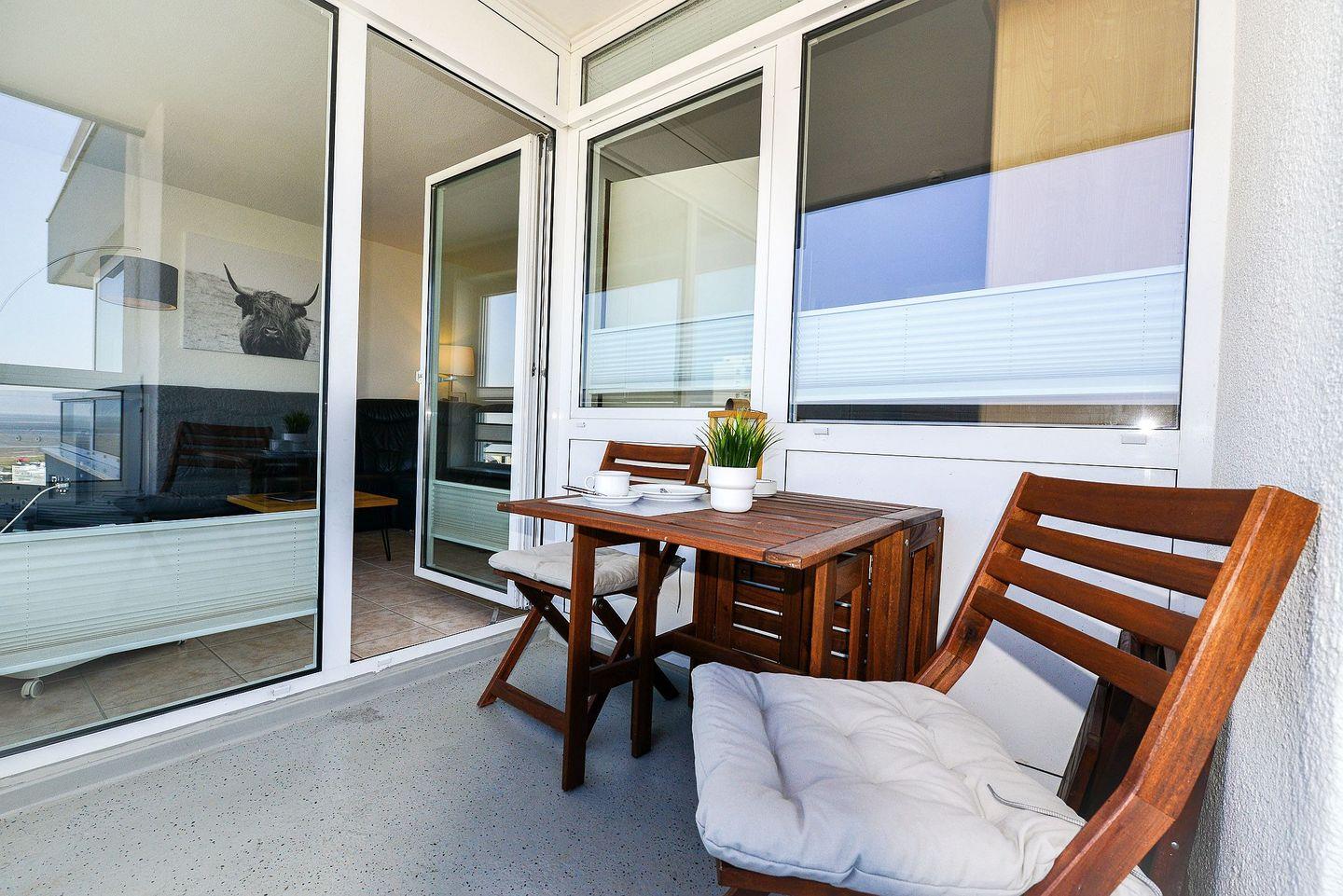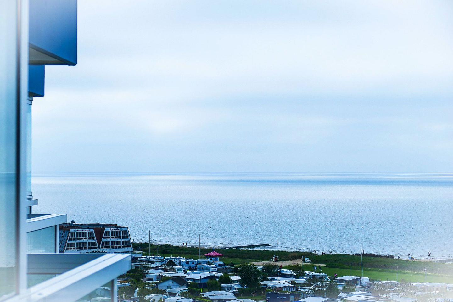 Ein besonderes Highlight der Ferienwohnung ist der überdachte Balkon, der Ihnen aus dem 10. Stockwerk eine wunderbare Panoramseesicht bietet.