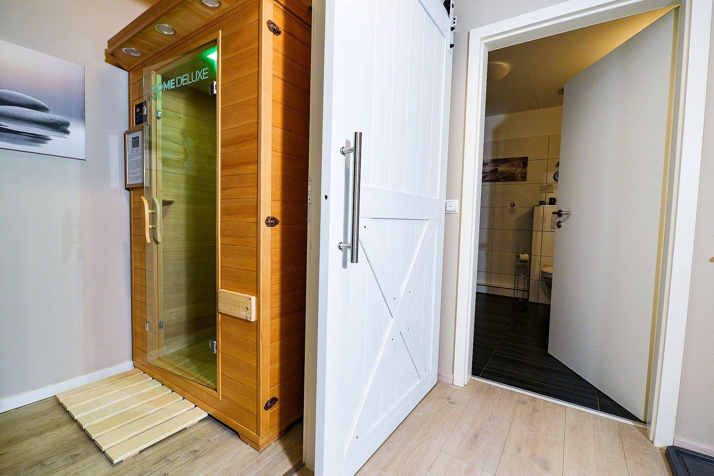 Der Wellnessbereich befindet sich in unmittelbarer Nähe und auf derselben Ebene wie die Wohnung. Hier erwartet Sie ein 29 °C warmes Schwimmbad mit Gegenstromanlage, eine großzügige Sauna, ein Dampfbad und ein Ruheraum mit Zugang zum Außenhof. Zusätzlich steht Ihnen eine kostenfreie Wärmekabine in der Wohnung für noch mehr Wohlfühlmomente zur Verfügung.