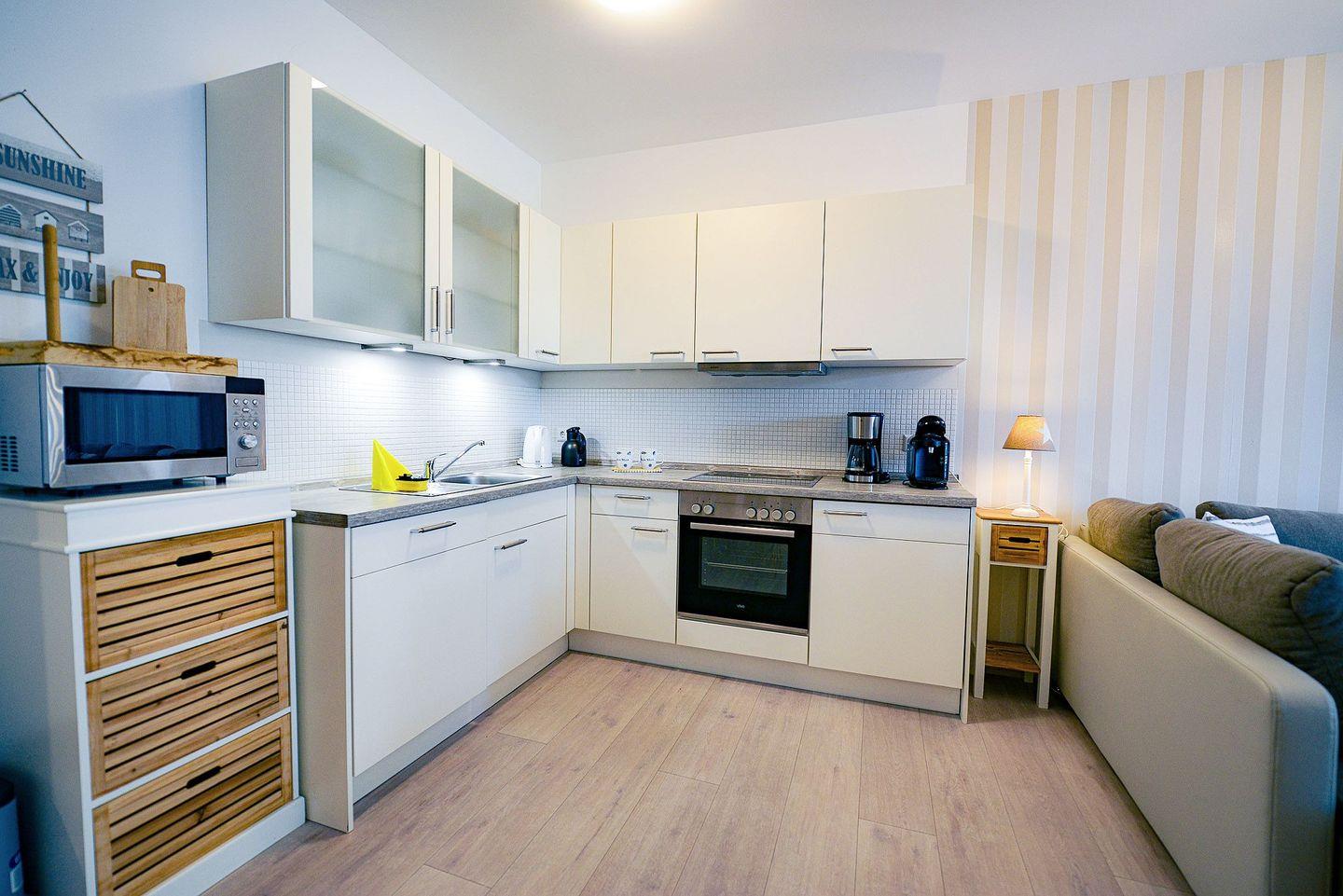 Die Ferienwohnung besticht durch eine voll ausgestattete Küche, ein modernes Bad sowie zwei Flatscreen-TVs, die Ihnen ein behagliches Zuhause auf Zeit bieten. Kostenloses WLAN und eine Tassimo-Kaffeemaschine gehören ebenfalls zur Ausstattung. Ihr Auto können Sie bequem auf den vorgesehenen Stellplätzen nutzen.