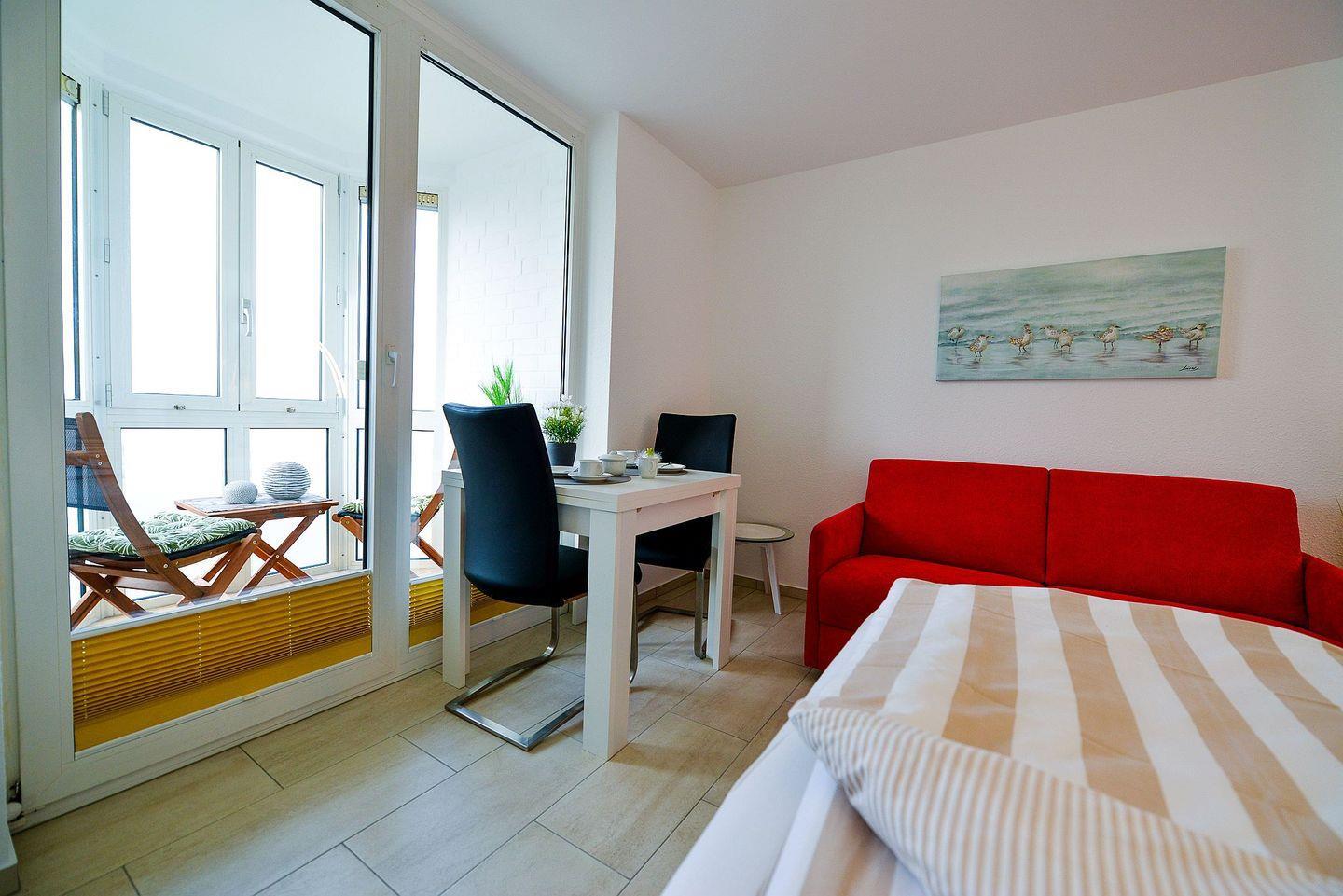 Möblierte 23?m²-Ferienwohnung im 2. OG an der Promenade mit direkter Seesicht und verglastem Westbalkon. Ideal für 2 Personen. Der Aufzug im Eingang 7a fährt bis ins 3. OG, die Wohnung erreicht man über den Außenbalkon und das Treppenhaus in Eingang 7 oder 7b. Moderne Ausstattung mit Küchenzeile, Geschirrspüler, Fußbodenheizung, WLAN, Parkplatz. Hunde erlaubt. Ruhige Lage nahe Strand und Wattenmeer.