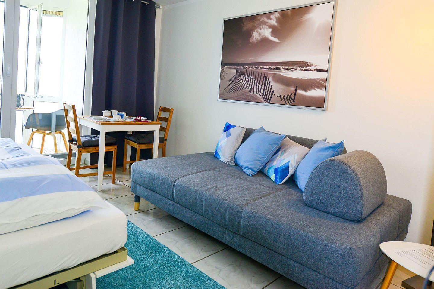 Gemütliche, preisgünstige Ferienwohnung direkt an der Promenade in Cuxhaven-Sahlenburg. Für 2 Personen, mit Balkon zur Seeseite, Aufzug, Sauna und Hund erlaubt.
