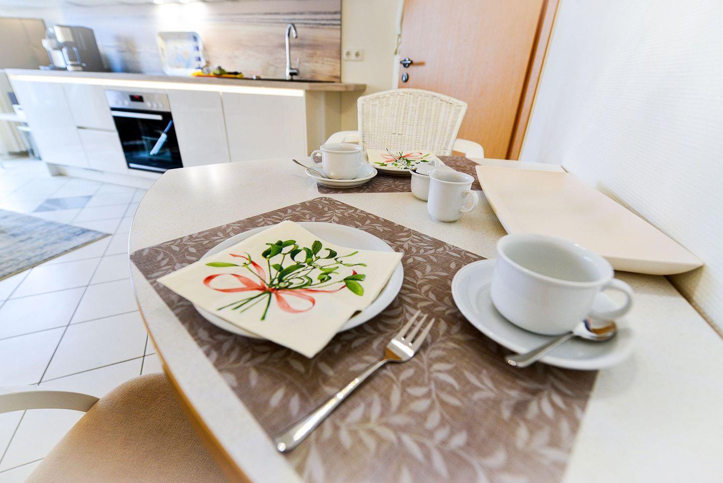 Die Wohnung verfügt über eine offene, voll ausgestattete Küchenzeile mit Senseo-Kaffeemaschine, Essplatz, zwei Flatscreen-TVs und kostenfreies WLAN. Die hochwertige Einrichtung schafft eine gemütliche Atmosphäre, perfekt zum Entspannen. Die Wohnung ist über eine Treppe gut zugänglich