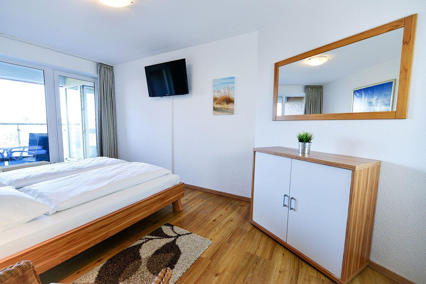 Vom Wohn- und Schlafzimmer aus gelangen Sie direkt auf den überdachten, windgeschützten Balkon – ein idealer Rückzugsort für entspannte Stunden zu jeder Tageszeit. Die ruhige Lage nahe am Strand macht diese Ferienwohnung zu einem Wohlfühlort für Erholungssuchende.