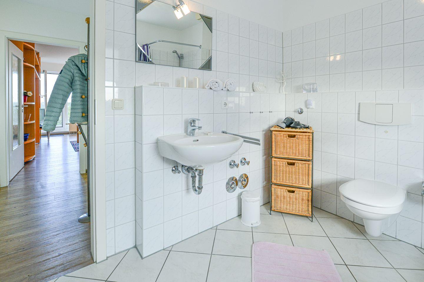 Das Tageslichtbad mit Dusche, Badewanne und WC sorgt für zusätzlichen Komfort. Ein eigener kostenloser PKW-Stellplatz steht direkt am Haus zur Verfügung. Für frische Brötchen am Morgen sorgt ein saisonal geöffneter Bäcker im Gebäude.
