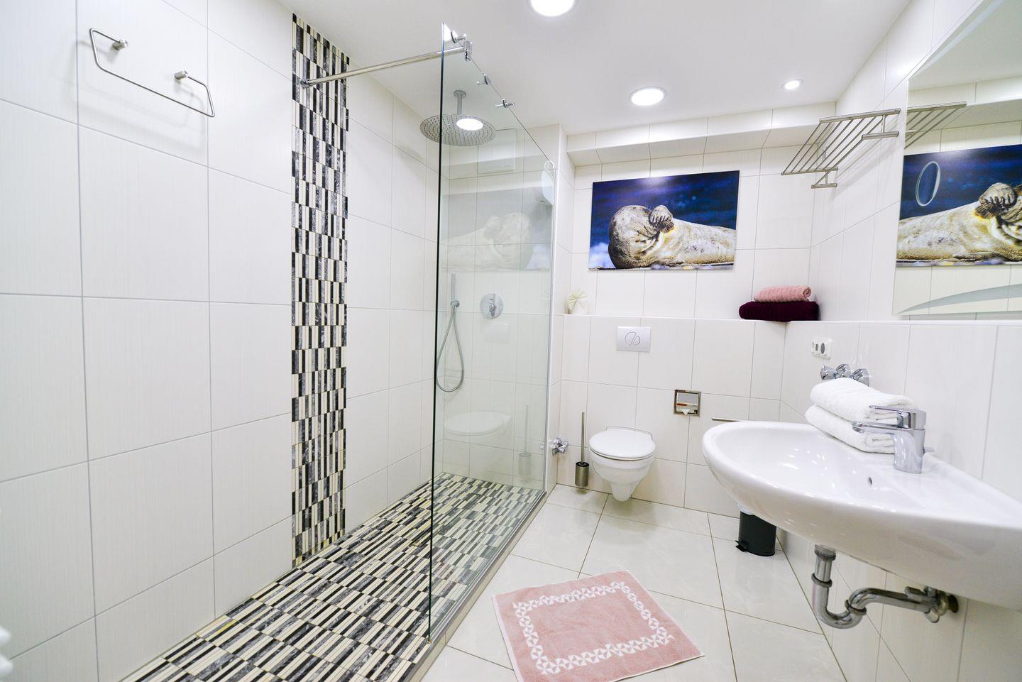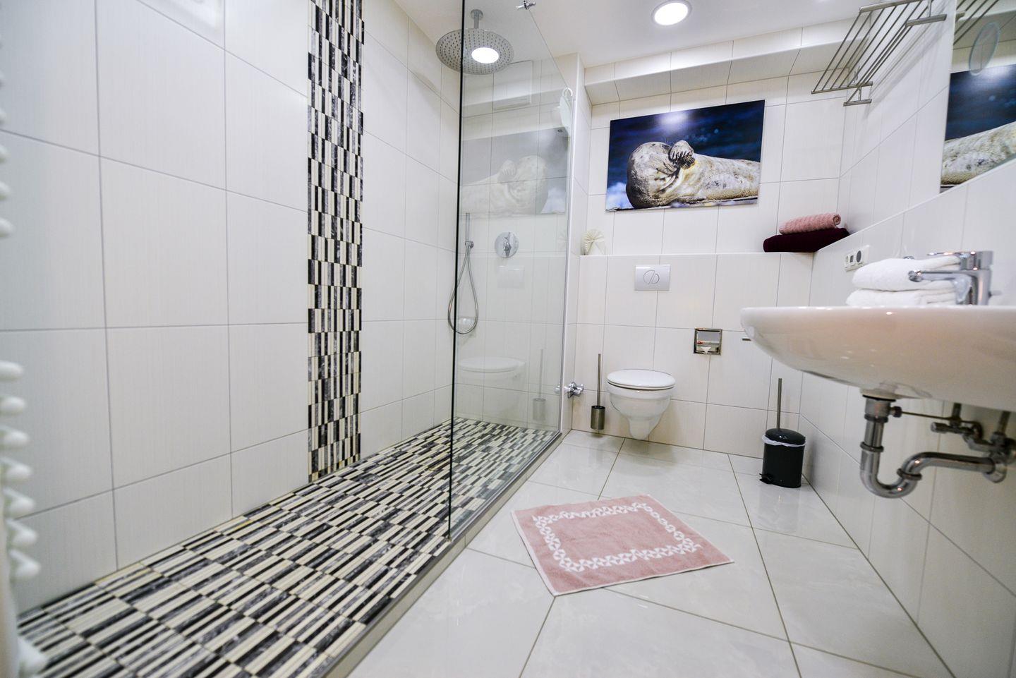 Einen erholsamen Start in die Urlaubstage garantiert Ihnen das neue Bad mit Flachdusche.