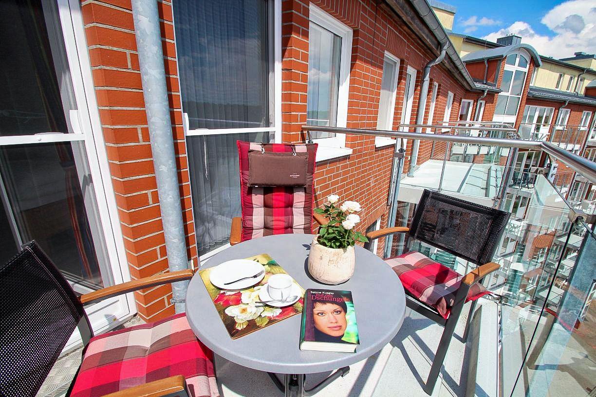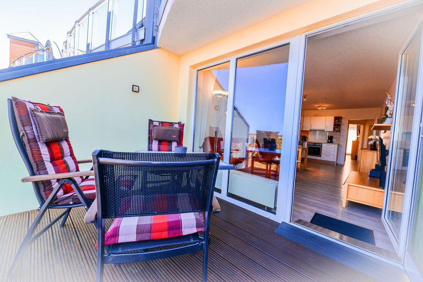 Lange und entspannte Stunden mit direktem Blick aufs Meer, die Insel Neuwerk und dazugehörigem Meeresrauschen garantiert der überdachte Balkon, der zum Ausspannen, Sonnen und Erholen von langen Strandstunden einlädt.