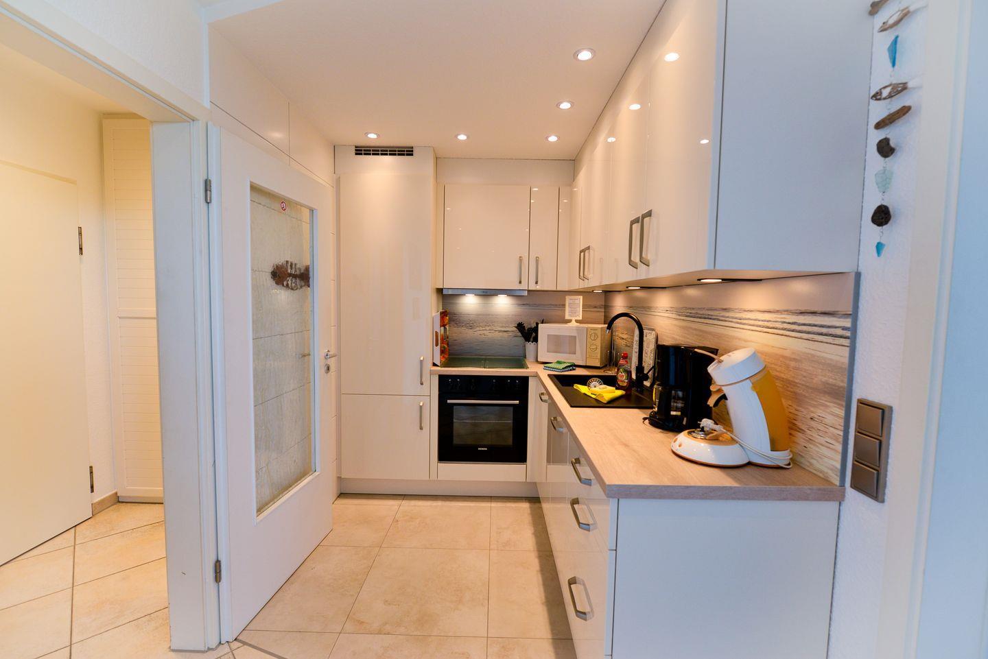 Die neue, voll ausgestattete Küche überzeugt nicht nur optisch, sondern auch funktional – inklusive Geschirrspüler, großem Kühlschrank und Senseo-Kaffeemaschine. Genießen Sie Ihre Mahlzeiten mit Blick auf das Meer – entweder im stilvollen Essbereich oder draußen auf dem Balkon.