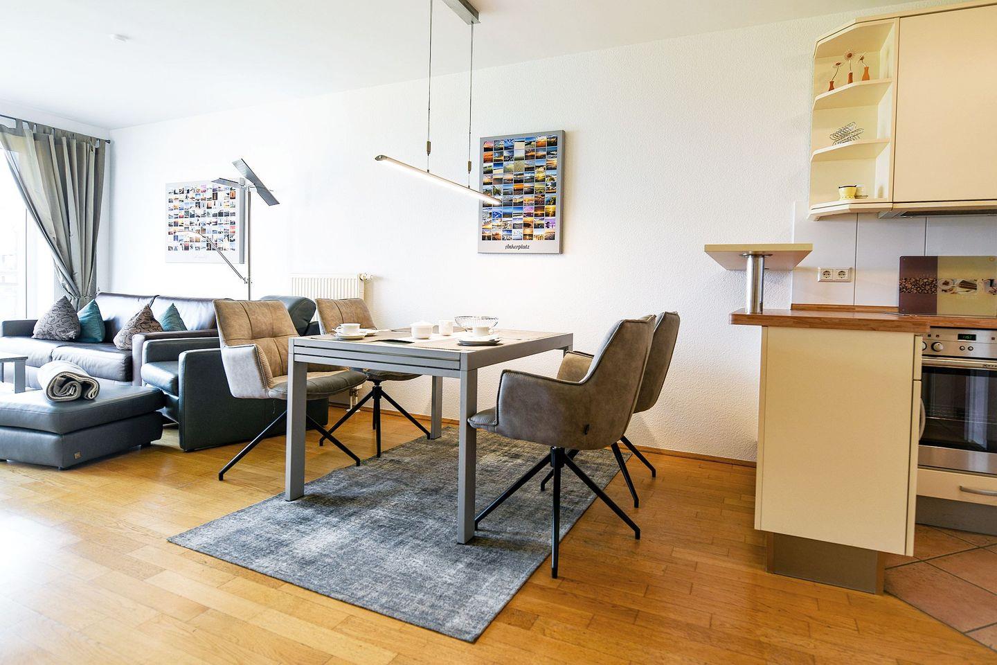 Die ca. 60?m² große, helle Ferienwohnung mit direktem Meerblick bietet ein stilvolles Ambiente und eine hochwertige Ausstattung. Eine voll ausgestattete Küchenzeile, ein modernes Duschbad, ein separates Schlafzimmer sowie ein Einzelschrankbett im Wohnraum sorgen für Komfort. Der große, überdachte Balkon mit Blick auf die Nordsee lädt zum Verweilen ein. WLAN, Flatscreen-TV, Festnetztelefon und ein Tiefgaragenstellplatz sind inklusive.
