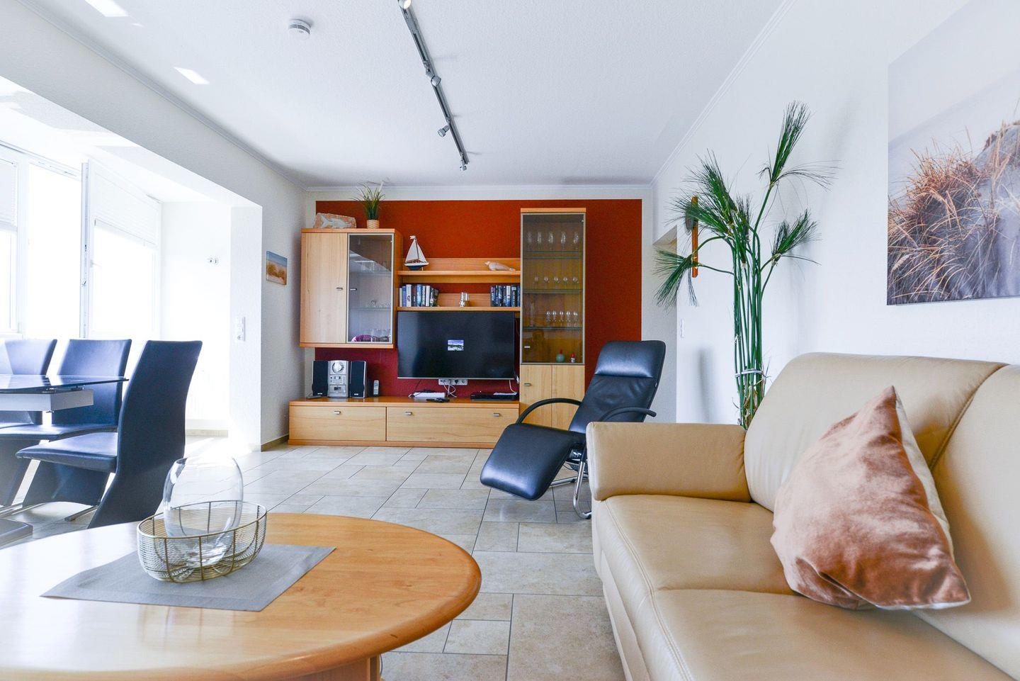 Die ca. 60m² große Ferienwohnung für 4 Personen begrüßt Sie mit angenehmem nordischen Flair, Schwimmbad, Sauna und viel Raum für einen entspannten Urlaub im schönen Norden Deutschlands - Meeresrauschen inklusive! Die helle Ferienwohnung mit seitlicher Seesicht befindet sich in unmittelbarer Strandlage mit einer modernen, offenen und vollausgestatteten Küche, sodass Sie jeden Urlaubstag mit einem entspannten und ausgewogenem Frühstück am Meer beginnen können. Erholung während Ihres Strandurlaubs garantieren Ihnen, neben dem wunderbaren Sandstrand, die verglaste und zu öffnende Fensterfront zur Südseite, das neue Badezimmer mit ansprechender Badewanne mit Whirpool, das Schwimmbad im eigenen Haus, sowie die Sauna, die gegen Gebühr genutzt werden kann. Gleich 2 Fernseher und der DVD-Player garantieren gemütliche und entspannte TV Abende, um sich vom langen Strandtag zu erholen und einfach die Seele baumeln zu lassen.