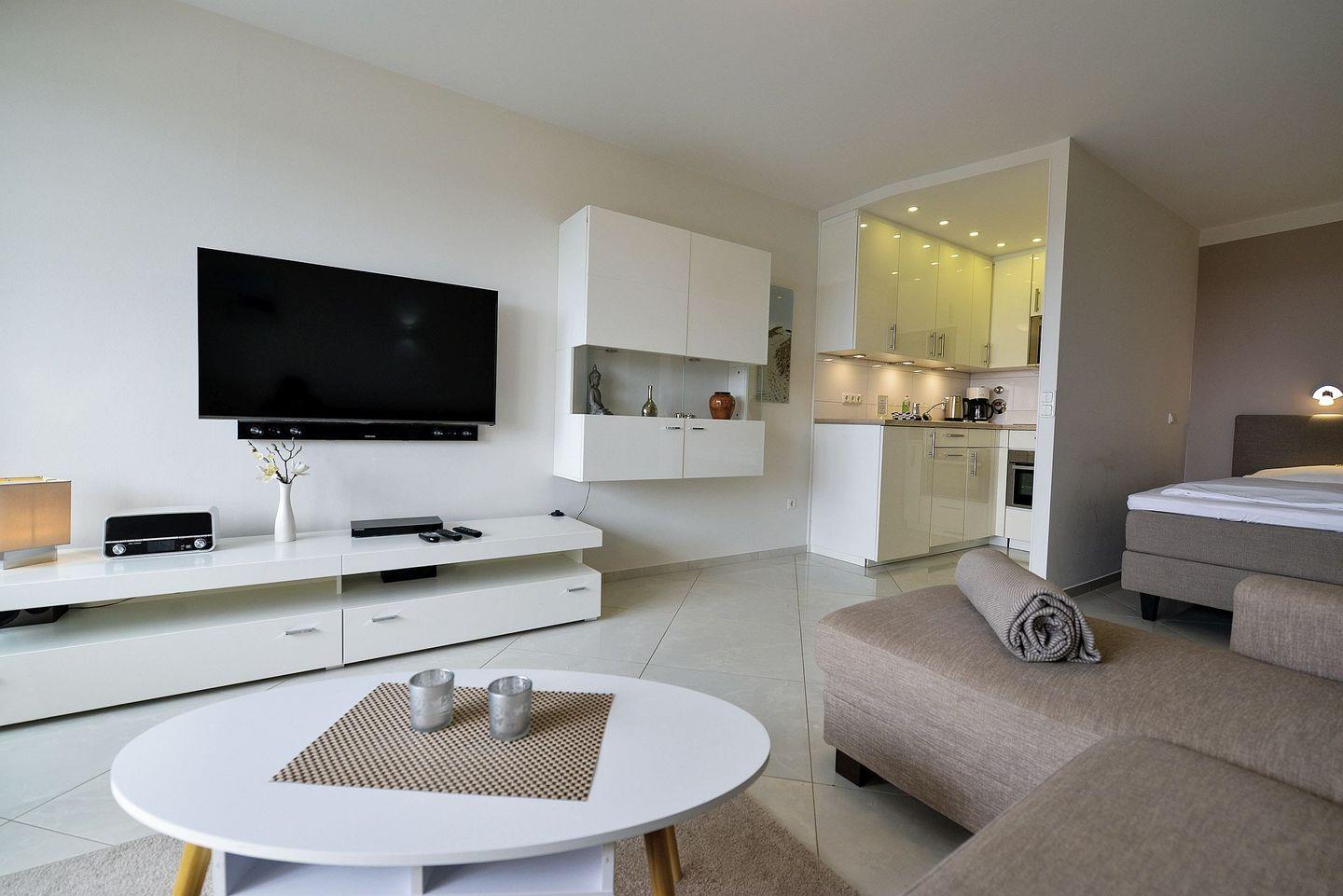 Die beiden Flatscreen TVs (einer davon 50 Zoll) und das kostenlose WLAN garantieren gemütliche und entspannte TV Abende, um sich vom langen Strandtag zu erholen und einfach die Seele baumeln zu lassen.