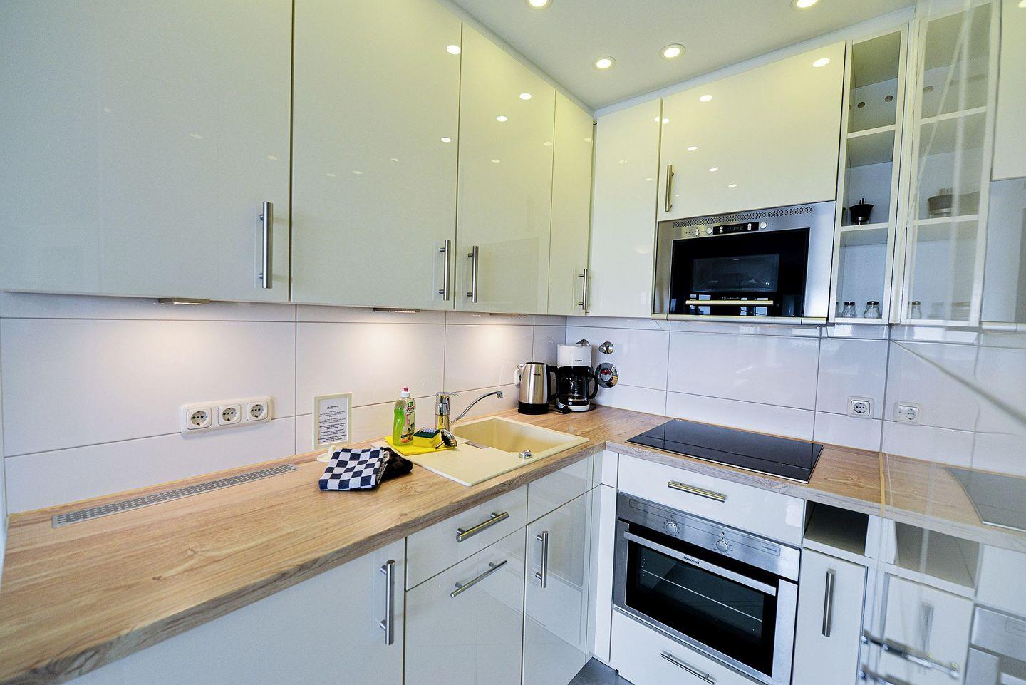 Die lichtdurchflutete Ferienwohnung mit seitlicher Seesicht befindet sich in direkter Strandlage mit einer modernen, offenen und vollausgestatteten Küche, sodass Sie jeden Urlaubstag mit einem entspannten Frühstück am Meer beginnen können.