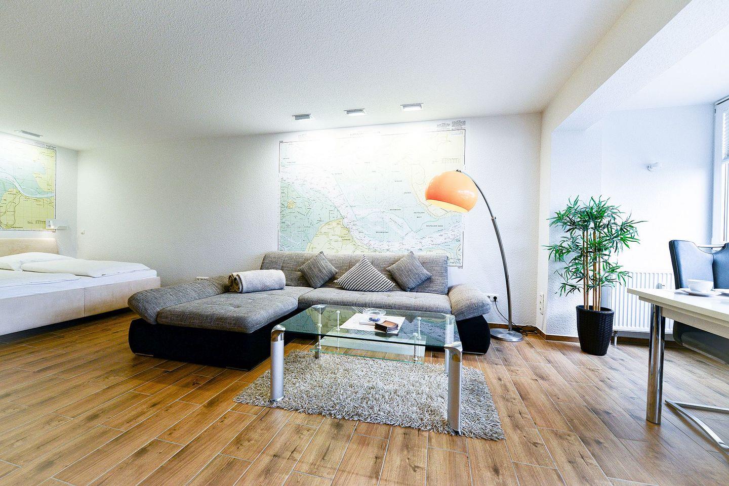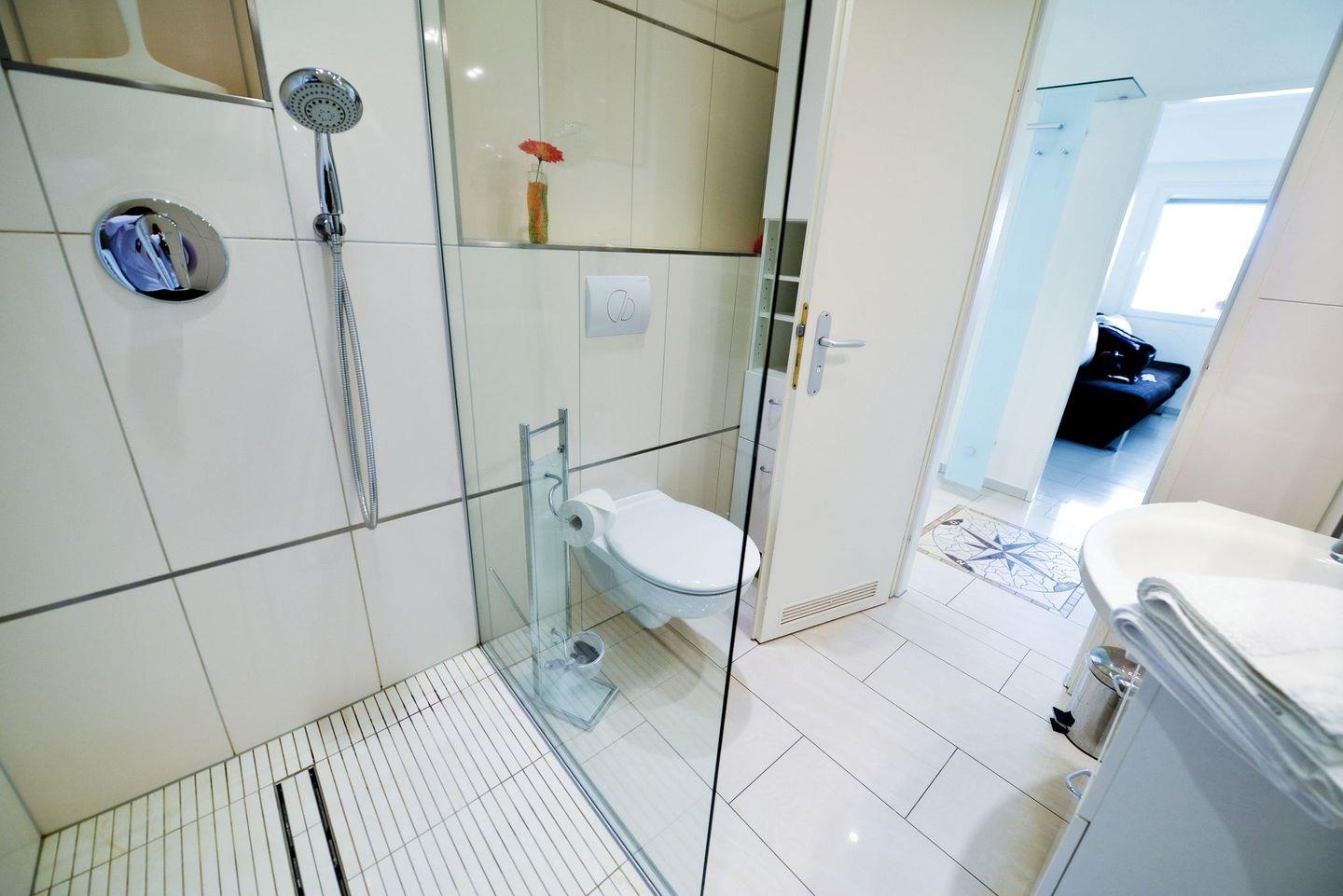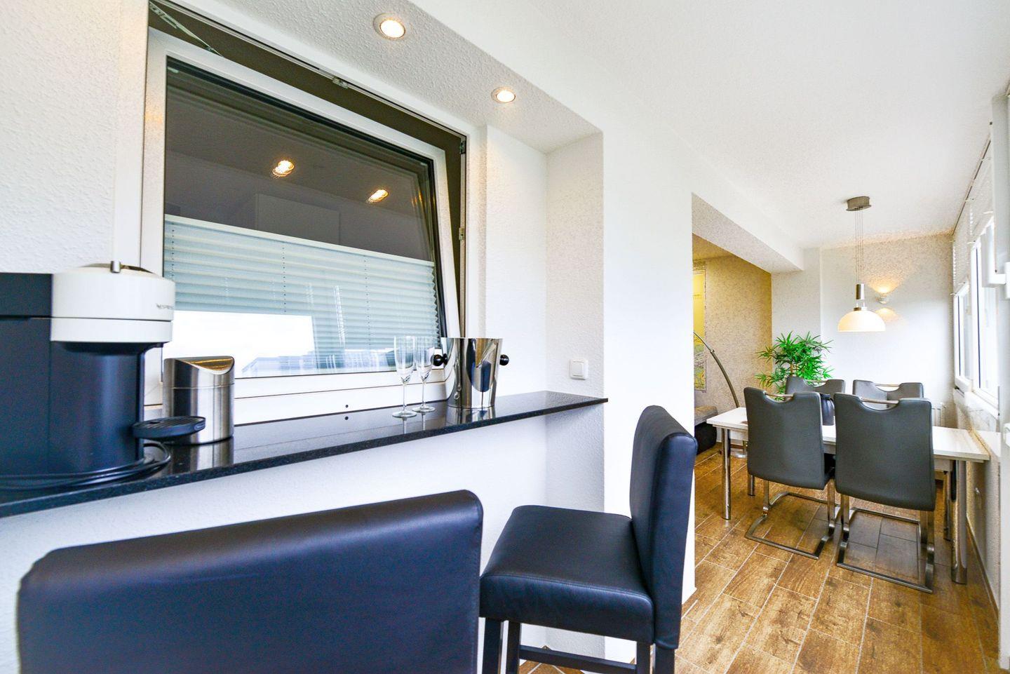 Ein separates Schlafzimmer mit Doppelschlafsofa, ein zusätzlicher Schlafplatz im Wohnbereich, eine offene Küche mit kompletter Ausstattung und ein modernes Bad mit ebenerdiger Dusche sorgen für Komfort. Die verglaste Südfensterfront lässt sich öffnen und bietet seitlichen Blick zur Nordsee. WLAN, zwei TVs sowie ein kostenfreier Parkplatz gehören zur Ausstattung. Die Sauna im Haus steht gegen Gebühr zur Verfügung. Hunde sind willkommen.