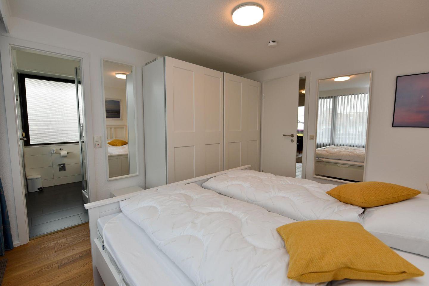 Im hellen Schlafzimmer sorgt ein komfortables Ehebett für erholsame Nächte. Ein geräumiger Kleiderschrank und ein großer Körperspiegel bieten zusätzlichen Komfort und machen die Ausstattung perfekt. Das Badezimmer verfügt über eine moderne Dusche und ein WC, ergänzt durch ein separates Gäste-WC, das vom Flur aus erreichbar ist.