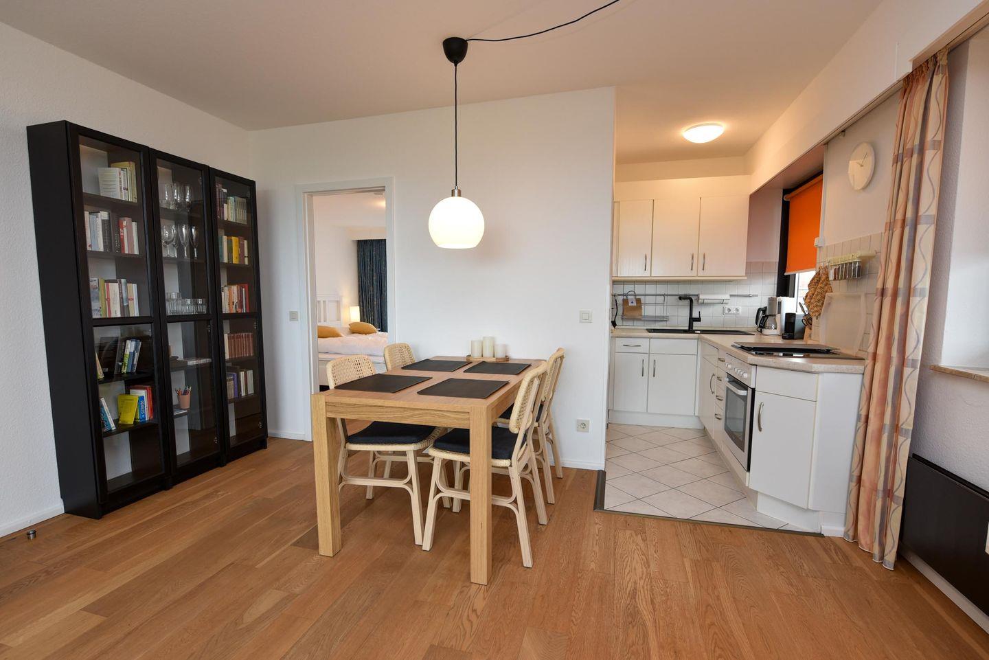 Der Wohn- und Essbereich lädt mit einem bequemen Sofa und einem Relax-Sessel dazu ein, den Ausblick auf das Wattenmeer zu genießen. Hier können Sie wunderbar abschalten und die Seele baumeln lassen. Der angrenzende Esstisch bietet ausreichend Platz, um in gemütlicher Atmosphäre zu speisen oder den Abend bei einem Glas Wein ausklingen zu lassen.