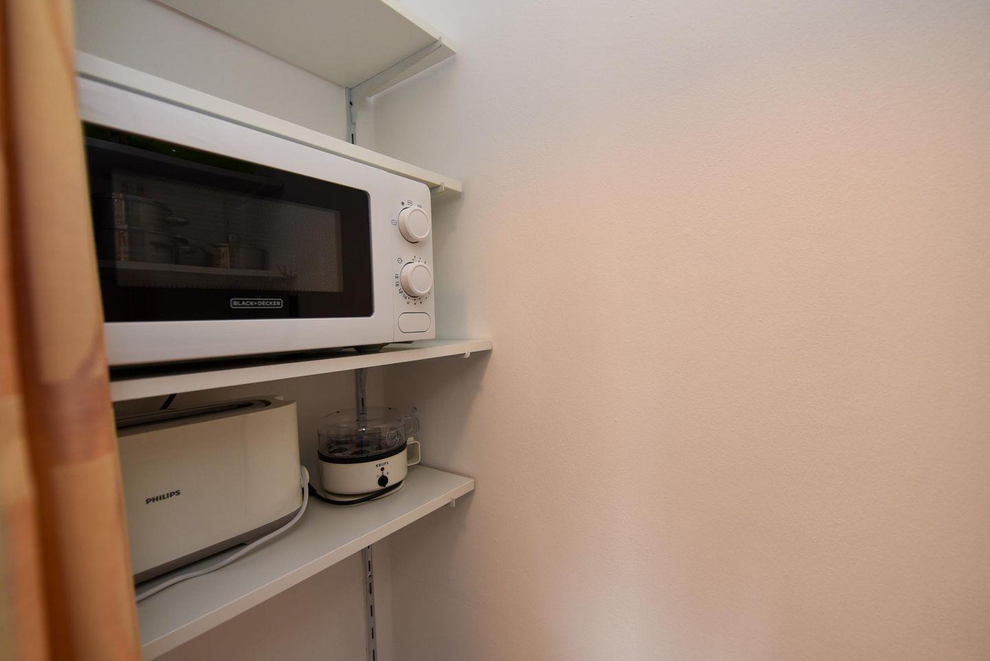 Die moderne Küche ist voll ausgestattet und lässt keine Wünsche offen. Neben einem Backofen und einer Mikrowelle stehen Ihnen auch ein Eierkocher und weitere praktische Geräte zur Verfügung, sodass Sie sich problemlos selbst versorgen können.