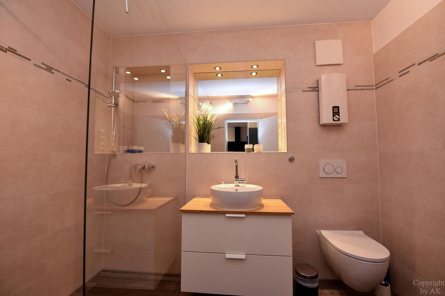 Erleben Sie pure Erholung im neu gestalteten Badezimmer. Die bodentiefe Dusche, umgeben von moderner Einrichtung und ausgestattet mit hochwertigen Sanitärelementen, garantiert Ihnen Luxus und Komfort. Hier können Sie sich von den Abenteuern des Tages erholen und neue Kräfte sammeln.