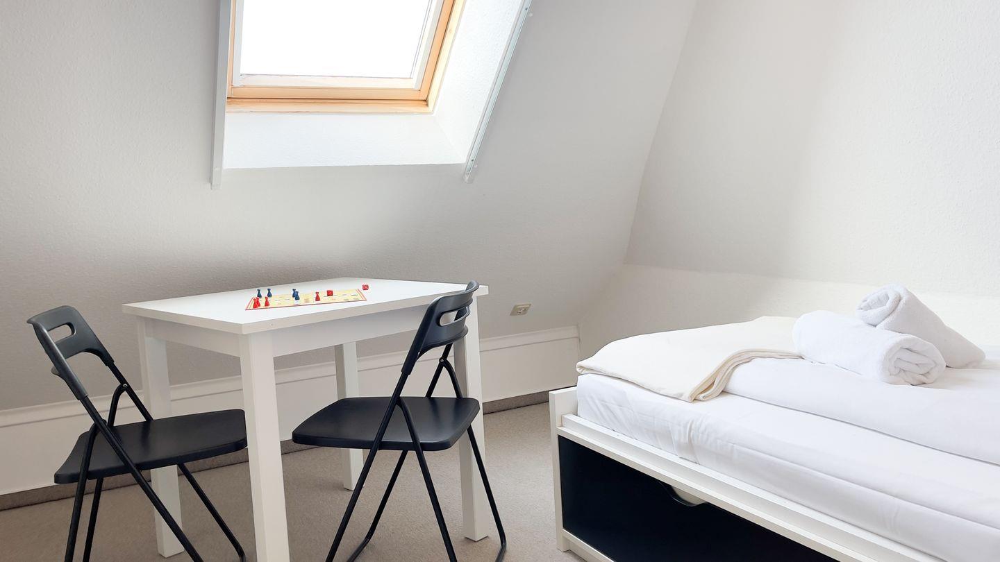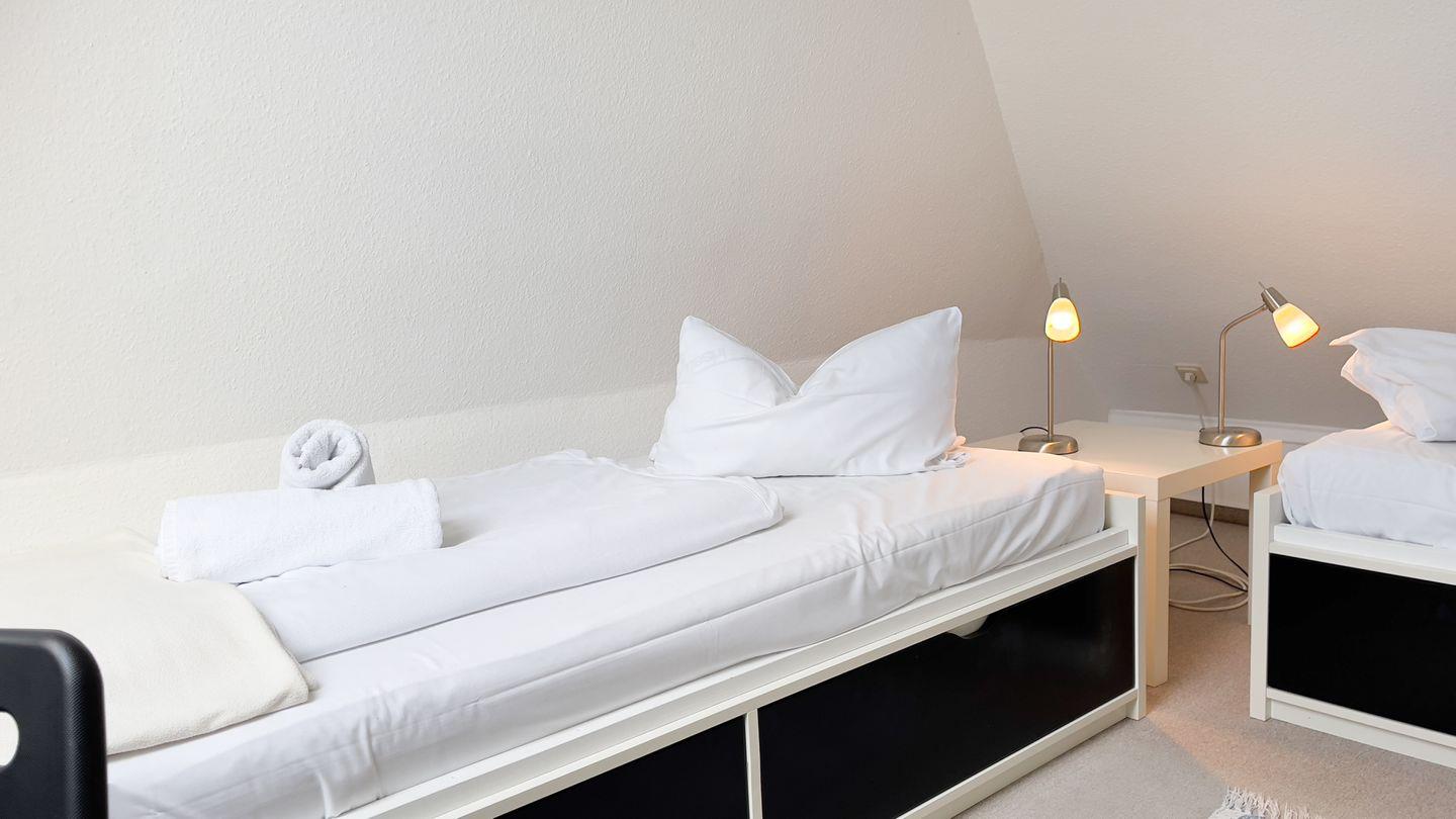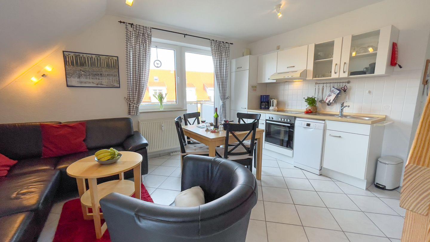 Die Wohnung verfügt über insgesamt drei Zimmer, darunter zwei separate Schlafzimmer. Der offene Küchenbereich ist zum Wohnzimmer ausgerichtet und bietet umfassende Ausstattung für Selbstversorger: Backofen (Elektroanschluss), 4-Platten-Herd, Kühlschrank, Mikrowelle, Gefrierfach, Kaffeemaschine, Wasserkocher, Toaster und Mixer stehen bereit. Sowohl Geschirr als auch Besteck und diverse Küchenutensilien sind vorhanden. Die Spülmaschine erleichtert Ihnen das Aufräumen nach den Mahlzeiten. Der gemütliche Essbereich bietet Platz für gemeinsame Essen.