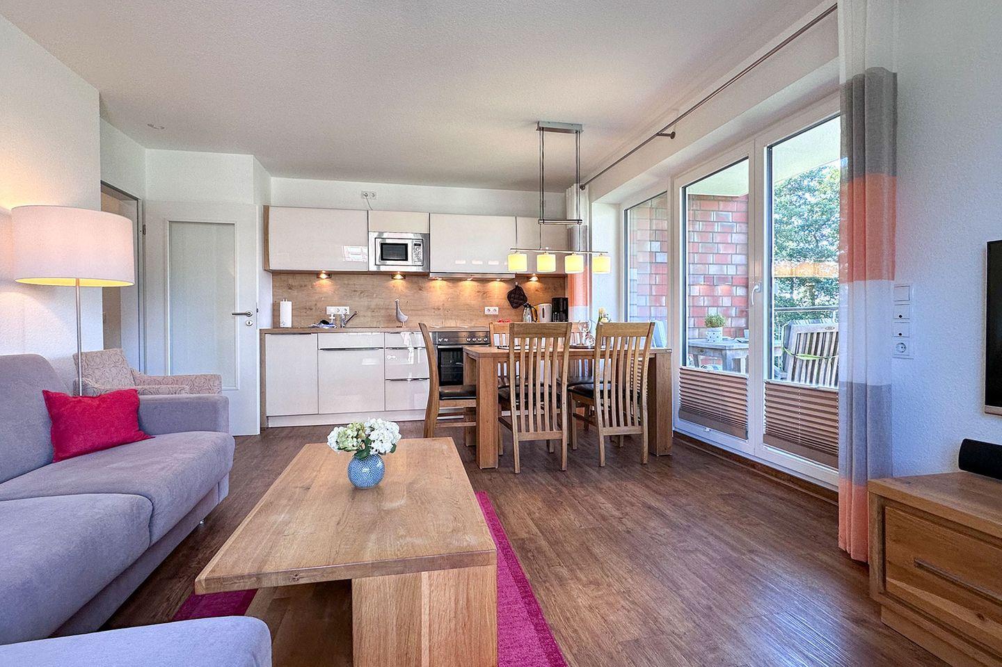 Die Residenz Hohe-Lith Ferienwohnung 404 bietet auf 67 m² modernen Komfort für bis zu 6 Personen. Zwei Schlafzimmer, ein offener Wohn- und Küchenbereich, bodengleiche Dusche, Gäste-WC, überdachter Balkon und WLAN sorgen für ein angenehmes Ambiente. Sauna, Infrarotkabine, beheizter Indoor-Pool und ein privater Parkplatz stehen ebenfalls zur Verfügung. Der Sandstrand ist nur 200 Meter entfernt.