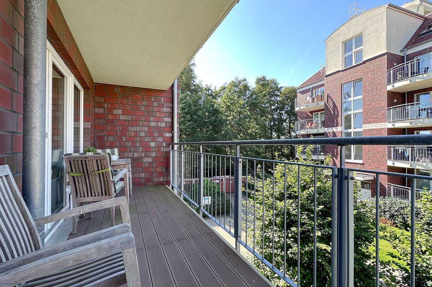 Sie wohnen in Haus 4 der Ferienanlage Residenz Hohe Lith in einer 3-Zimmer-Ferienwohnung im Hochparterre mit Balkon und Platz für bis zu 6 Personen. Auf dem überdachten Balkon können Sie die Sonne genießen und entspannen. Die Ferienwohnung verfügt über zwei Schlafzimmer, ein Badezimmer, ein Gäste-WC und einen Wohn-/Essbereich mit Schlafcouch. Die Zimmer sind mit modernen und hochwertigen Möbeln ausgestattet und bieten Ihnen eine gemütliche Umgebung für Ihren Urlaub. Die moderne Küchenzeile ist mit Geschirrspüler, Mikrowelle, Backofen, Cerankochfeld mit Dunstabzugshaube u.v.m. voll ausgestattet. Auf dem Parkdeck zwischen den Tiefgaragen ist ein Stellplatz für Sie reserviert. Hier finden Sie einen leicht zugänglichen, abschließbaren Fahrradraum.