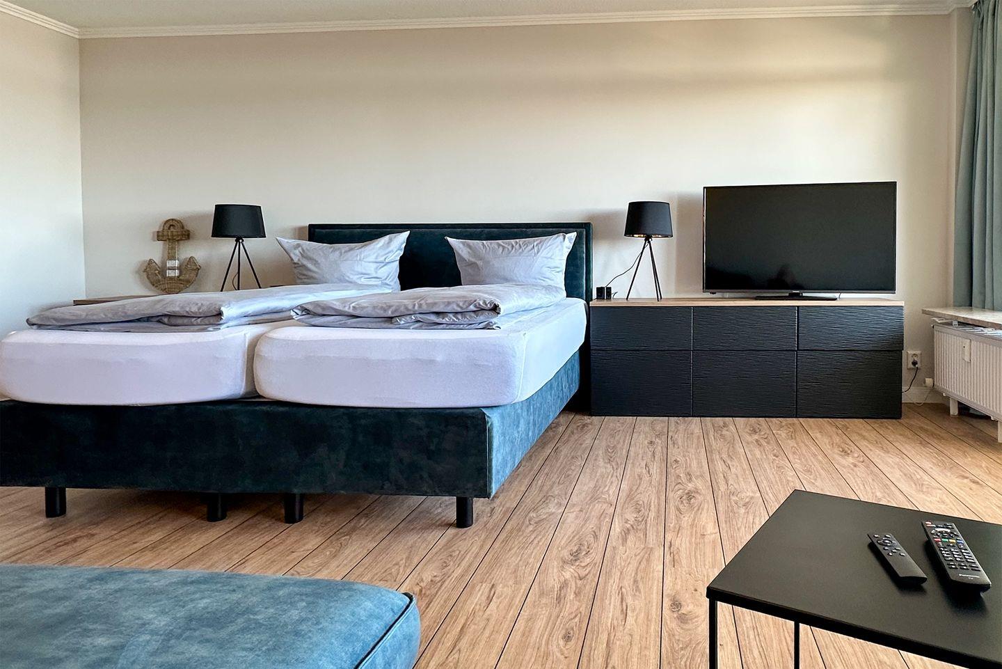 Panoramahaus Duhnen: Dieses geschmackvoll eingerichtete, große 1-Raum-Appartement mit Balkon und Meerblick in Richtung Nord-Ost direkt beim Dorfbrunnen im Herzen von Duhnen gelegen wurde im Frühjahr 2023 für Sie komplett renoviert.