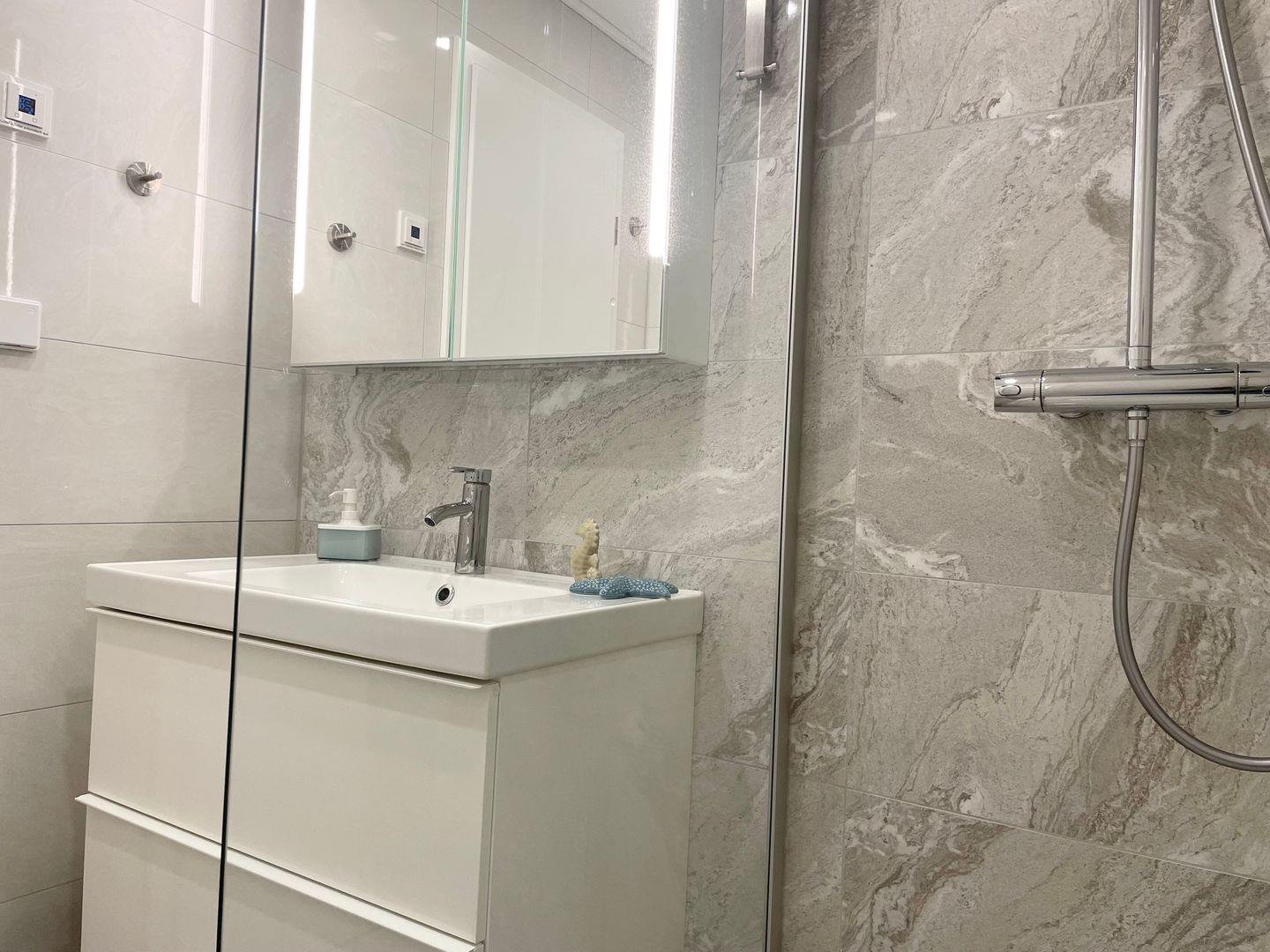 Das hauseigene Schwimmbad sowie die Sauna im Keller erreichen Sie direkt über den Aufzug. Anschließend entspannen Sie unter der Regendusche in der großen (90x150cm) bodennahen Duschwanne im Duschbad. Störungen durch „Ich muss mal auf die Toilette“ sind hier auszuschließen, denn die Toilette ist mit eigenem Waschbecken nebenan im Toilettenbad untergebracht. Beide Bäder sind mit Spiegelschrank, Waschbecken mit Unterschrank sowie Handtuchheizung gestaltet. Auch ein Fön gehört selbstverständlich zur Standardausstattung.