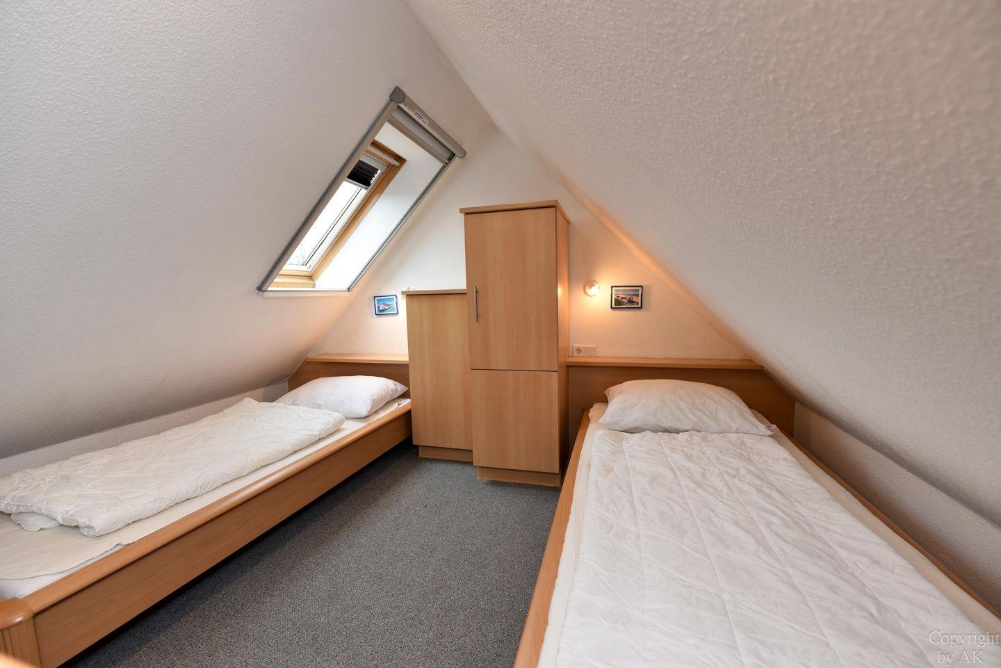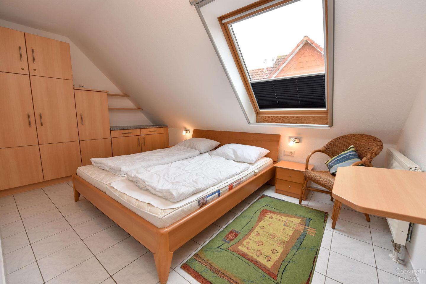 Die Ferienwohnung ist für bis zu 4 Personen geeignet und ist aufgeteilt in einen separaten Schlafraum mit einem Doppelbett und einen gemütlichen Schlafbereich mit 2 Einzelbetten (90cmx200cm) im ausgebauten Dachgeschoss, welches Sie über eine Treppe erreichen. Der Wohnbereich ist u.a. mit Essbereich und heller Einbauküche ausgestattet. Von hier haben Sie Zugang zum Balkon. Der gemütliche und sonnige Balkon, mit Balkonmöbeln lädt zum Urlauben ein. Das Duschbad/WC hat ein Fenster, so dass es auch hier Tageslicht gibt.