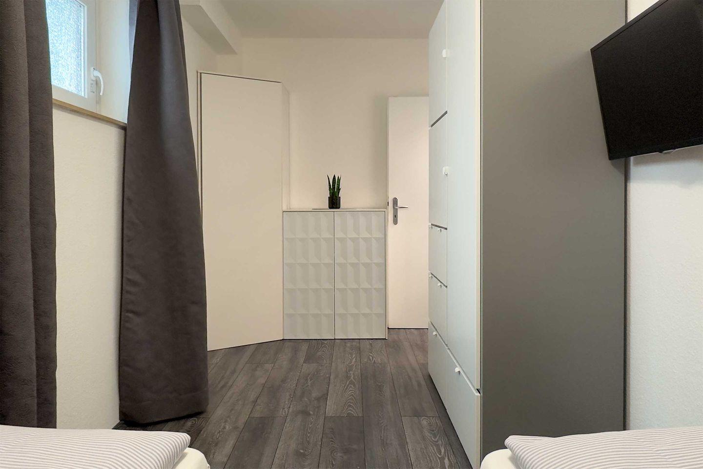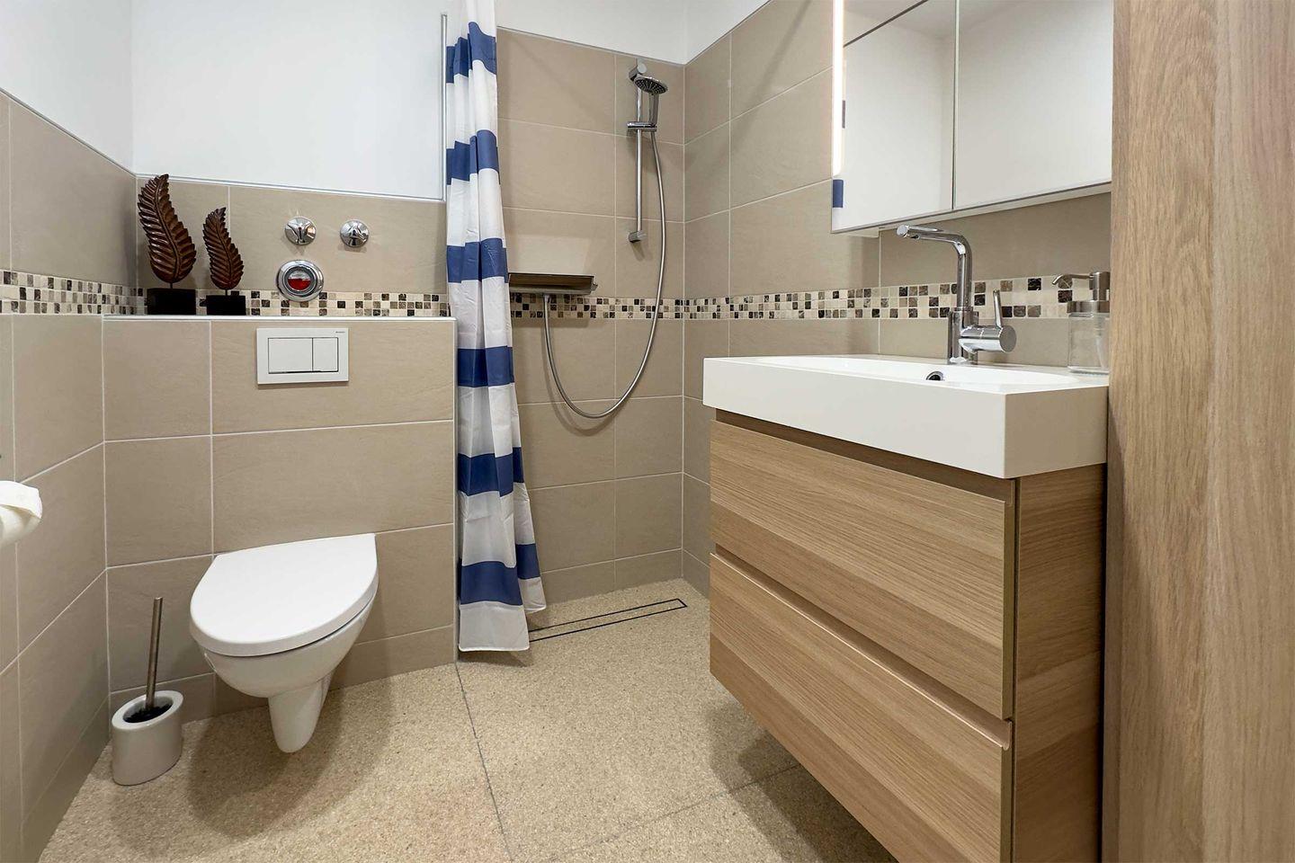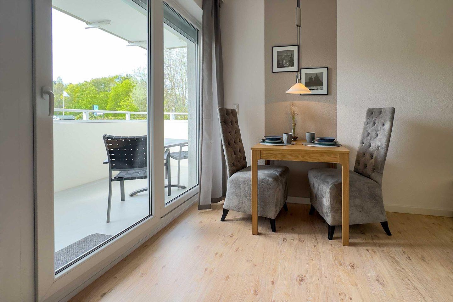 Sie wohnen auf ca. 40 m² Wohnfläche in einem hellen und geschmackvoll eingerichteten Wohnraum mit Balkon, einem gemütlichen Essplatz und einer zum Wohnraum offenen Küche. Ihrer Lust am Kochen können Sie in der voll ausgestatteten Küche nachgehen oder Sie entspannen im modern eingerichteten Wohnzimmer sowie auf dem Balkon. Dank des WLAN mit eigenem Router bleiben Sie während Ihres Urlaubs online und können Ihre Erlebnisse gleich mit Ihren Liebsten teilen. Das separate Schlafzimmer ist mit zwei Box-Betten ausgestattet. Die BodyGuard-Matratzen lassen sich einfach wenden, hier schlafen Sie wahlweise etwas fester oder etwas weicher.