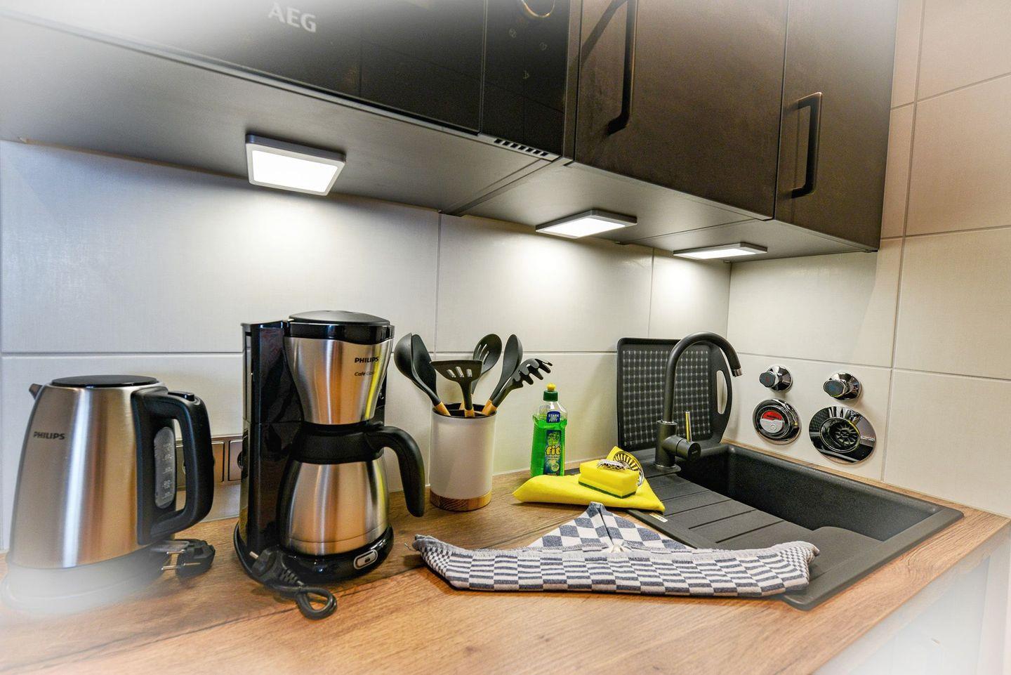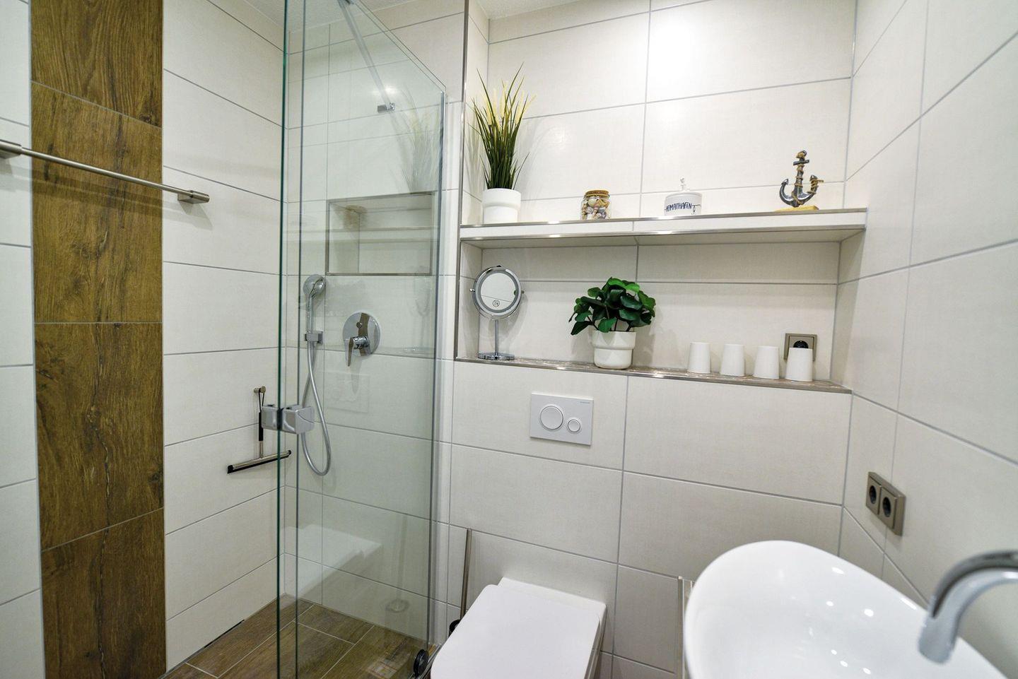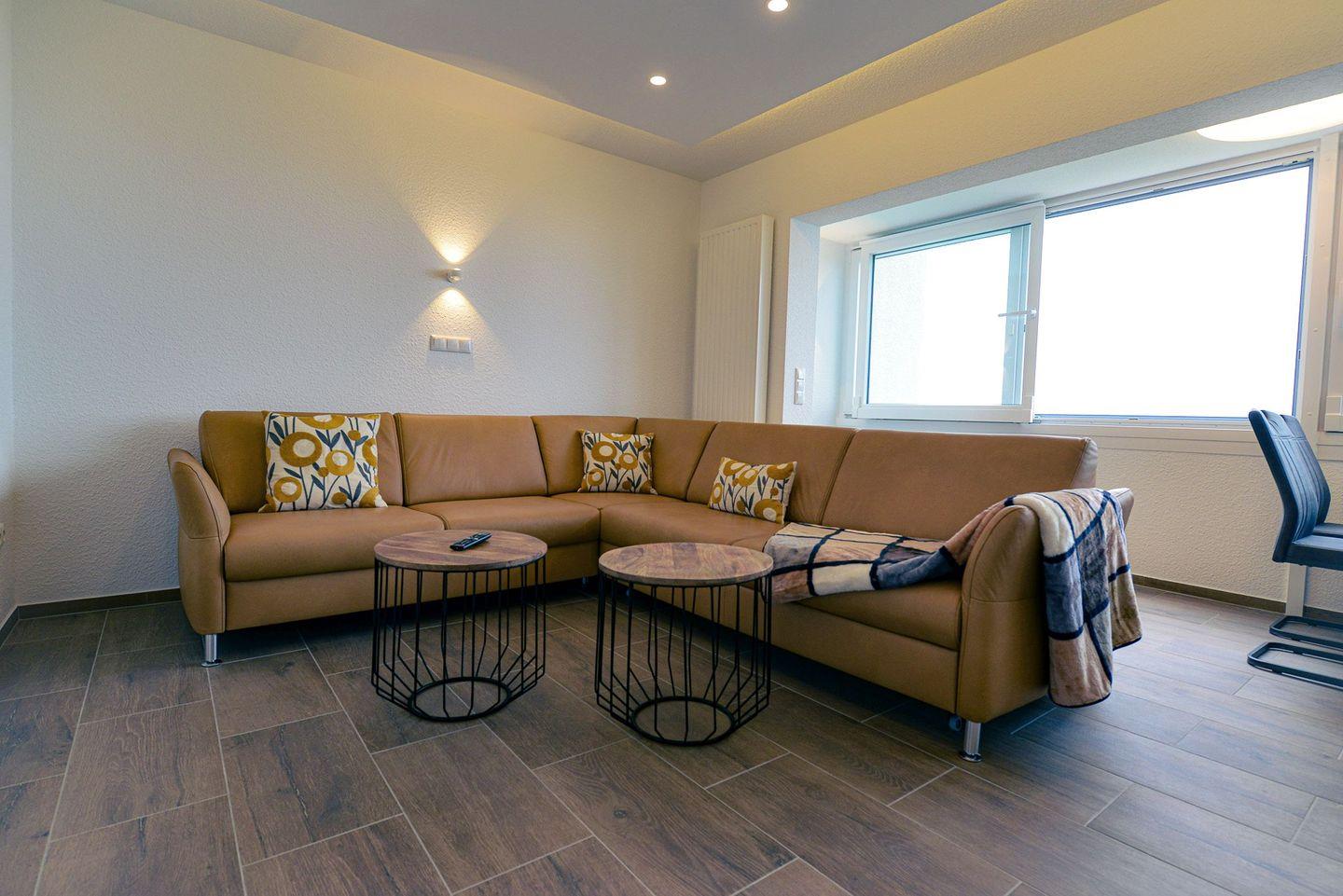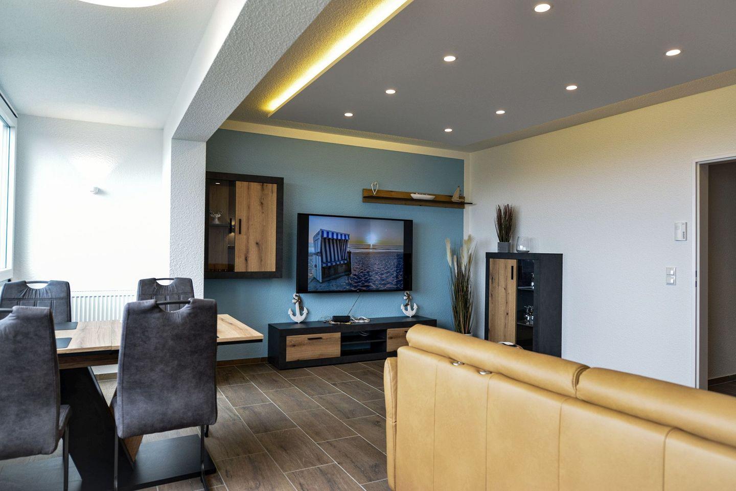 Die 50 m² große Wohnung verbindet modernen Komfort mit norddeutschem Flair. Der helle Wohn- und Essbereich verfügt über eine voll ausgestattete Küche mit Geschirrspüler, Backofen, Kaffeemaschine sowie einer NESCAFÉ Dolce Gusto Kapselmaschine – perfekt für den ersten Kaffee am Morgen mit Meerblick. Zwei Flatscreen-TVs, ein separates Schlafzimmer und ein modernes Bad sorgen für entspannte Urlaubstage.